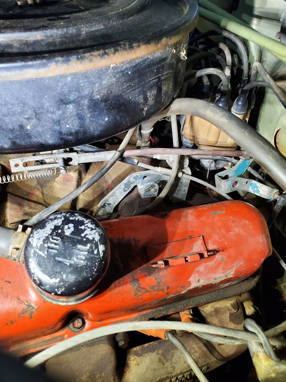 From the photo, Looks like it has a 2 barrel carb on it... The linkage looks correct, Its just missing the 1 pivot bracket... As far as i know, you can still get that bracket..