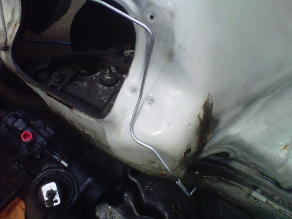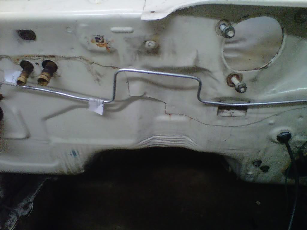 When I first found the brake lines at In-Line Tube they are listed for a 1976-1980 Plymouth Roadrunner/Volare...I assumed a F body was a F body and I even called them...hence the learning curve...Plymouth routed thier front brake lines different than Dodge did...the ones from the master cylinder to the proportional valve are good to go...I have to send three of mine back to make them for a Dodge...the front driver's side was close but not right..see where the rust line is that's where the brake line should be...