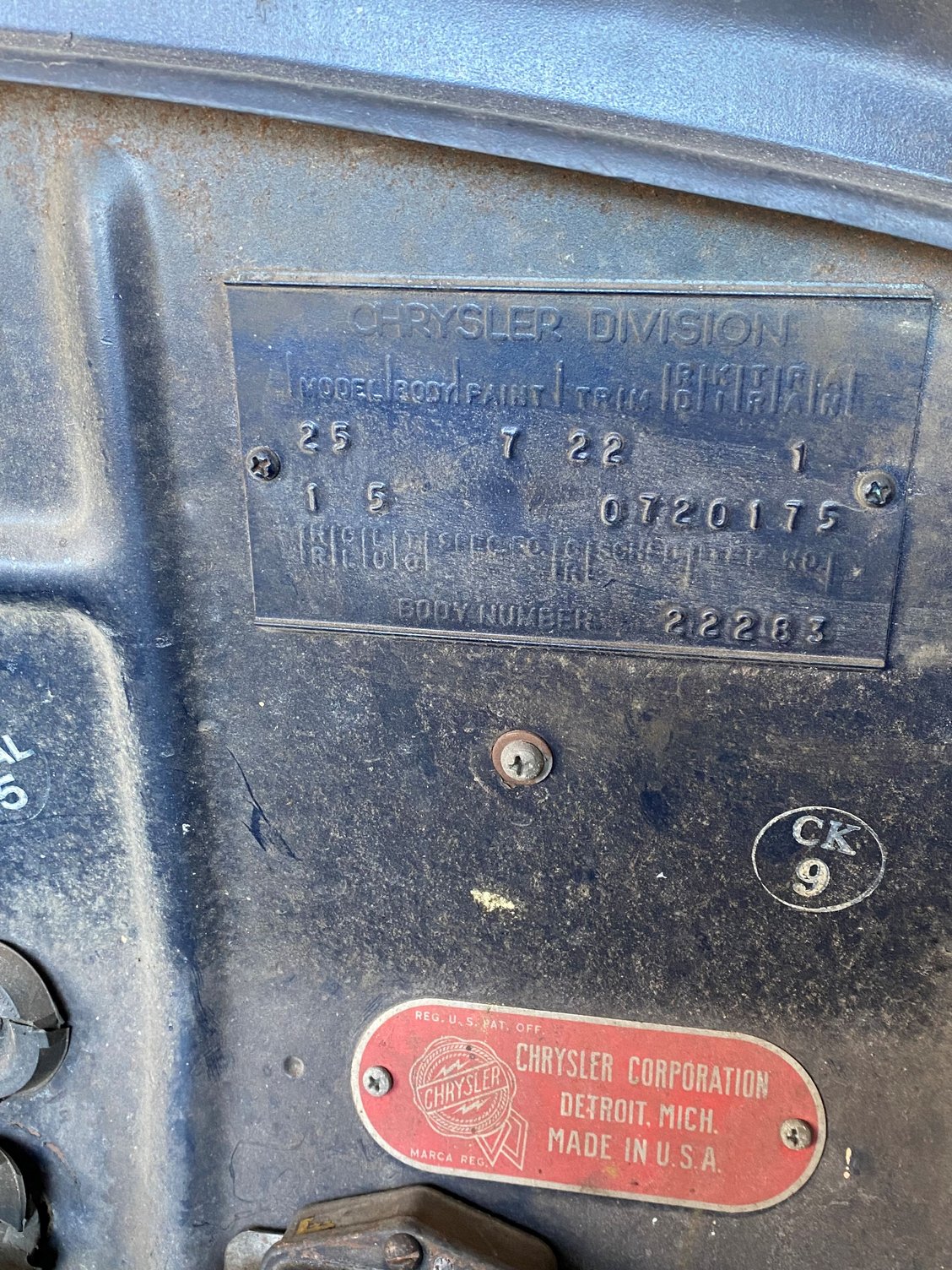 I help run an estate sale company and one of my clients has this old car in his garage that he may ask me to sell for him as part of his estate. I think he said it was a 1951 Windsor. I told him I would try to do some research on it. I was trying to decipher the cowl tag but I'm having a hard time finding info for 50's chryslers. If anyone can direct me to a way to decipher the codes that would be great. I'm also trying to get a general idea of value. The client says the paint has been re-done and it does run although sometimes it smokes from the engine. The interior is in nice shape except the front floorboard may need to be replaced. He is nearing 100 years old so he has not had a chance to work on it and he couldn't give me much more info. Any help would be appreciated.