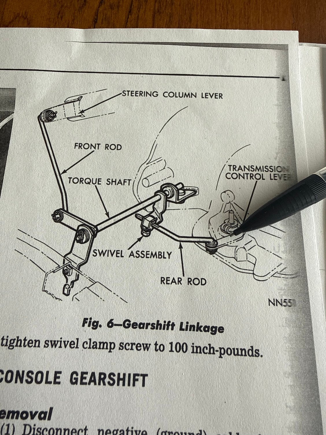 Well there are two torque shafts. One is tied to the column lever in the engine compartment that is engaged by the upper rod that is attached to a… torque shaft… (see illustration). The other torque shaft is from the console shift (see illustration)…. You missed the question anyhow but thanks for your input. I appreciate anything I can get. Have a great day!