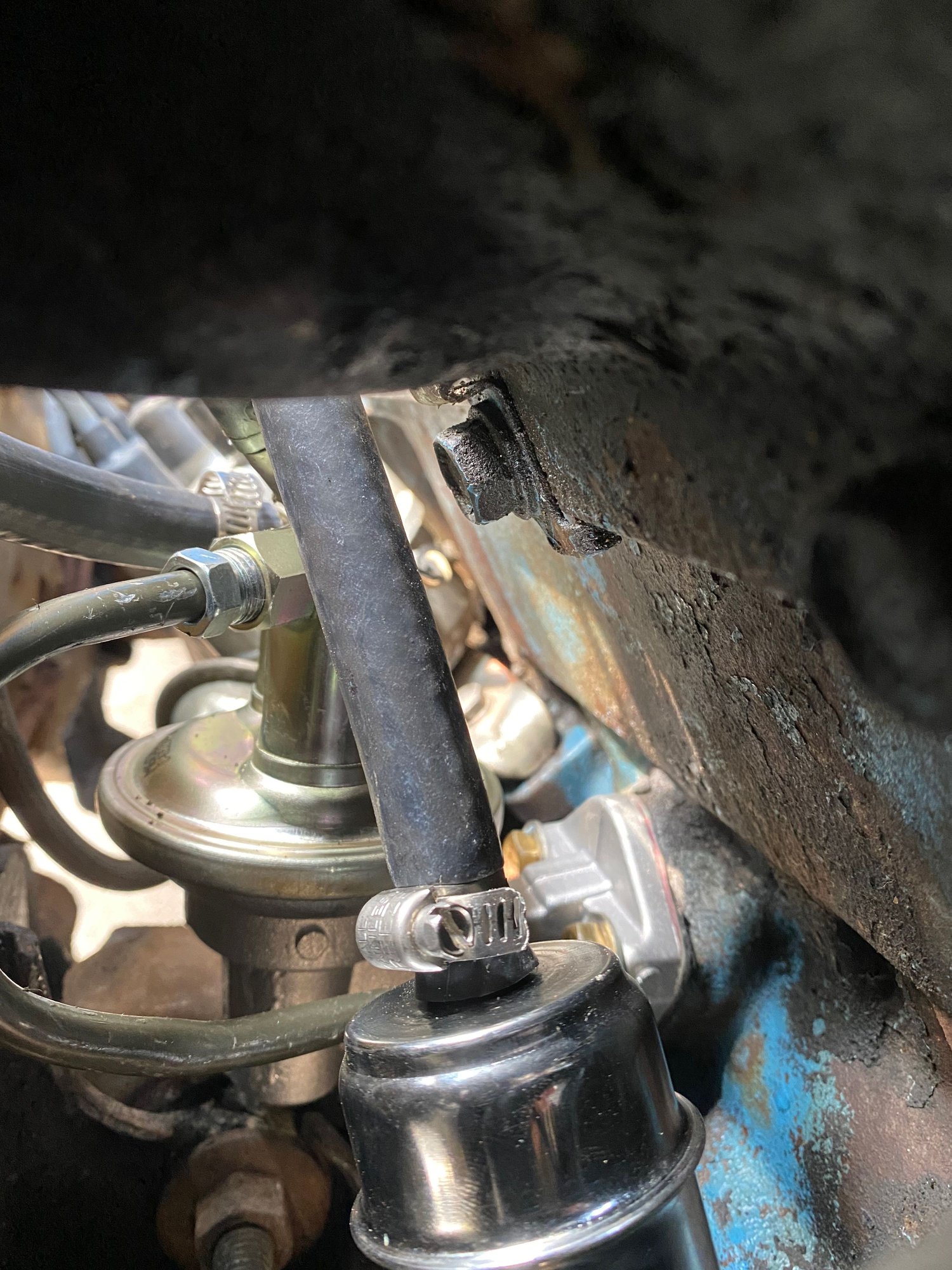 Of course you want to keep the vacuum line on the timing advance, but there is one other line that runs from the fuel system to the charcoal can, I had plugged this line up and just left it plugged by where the can used to be. This line vents excess pressure in the fuel system into the charcoal can, I think.