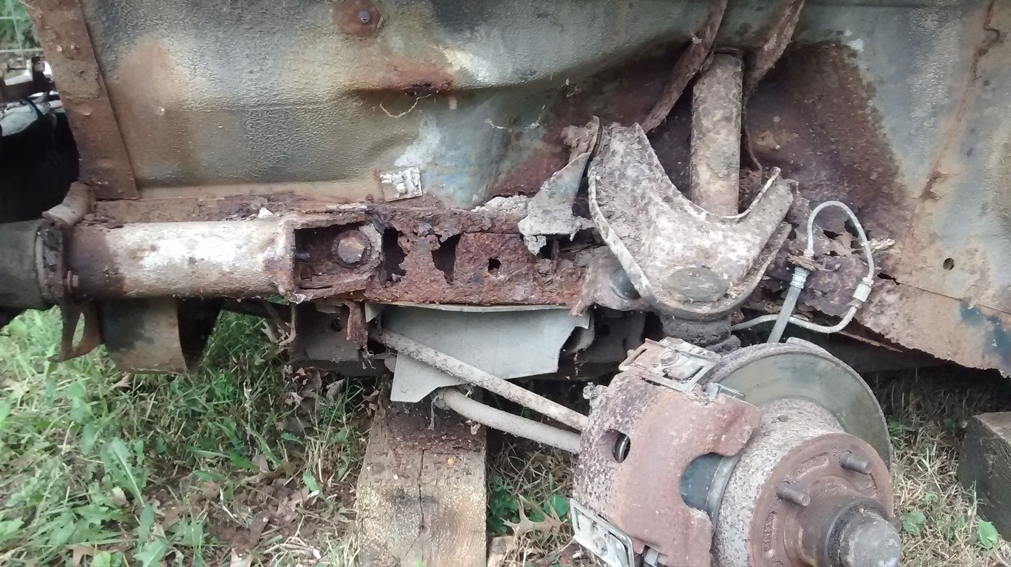 If I were you I would look under the vehicle at the location where the rear of the torsion bars go into the frame crossmember. They are prone to rust and when they fail the front of the car drops. That's some sever frame rot there and before you spend money on repairs look the car over again.