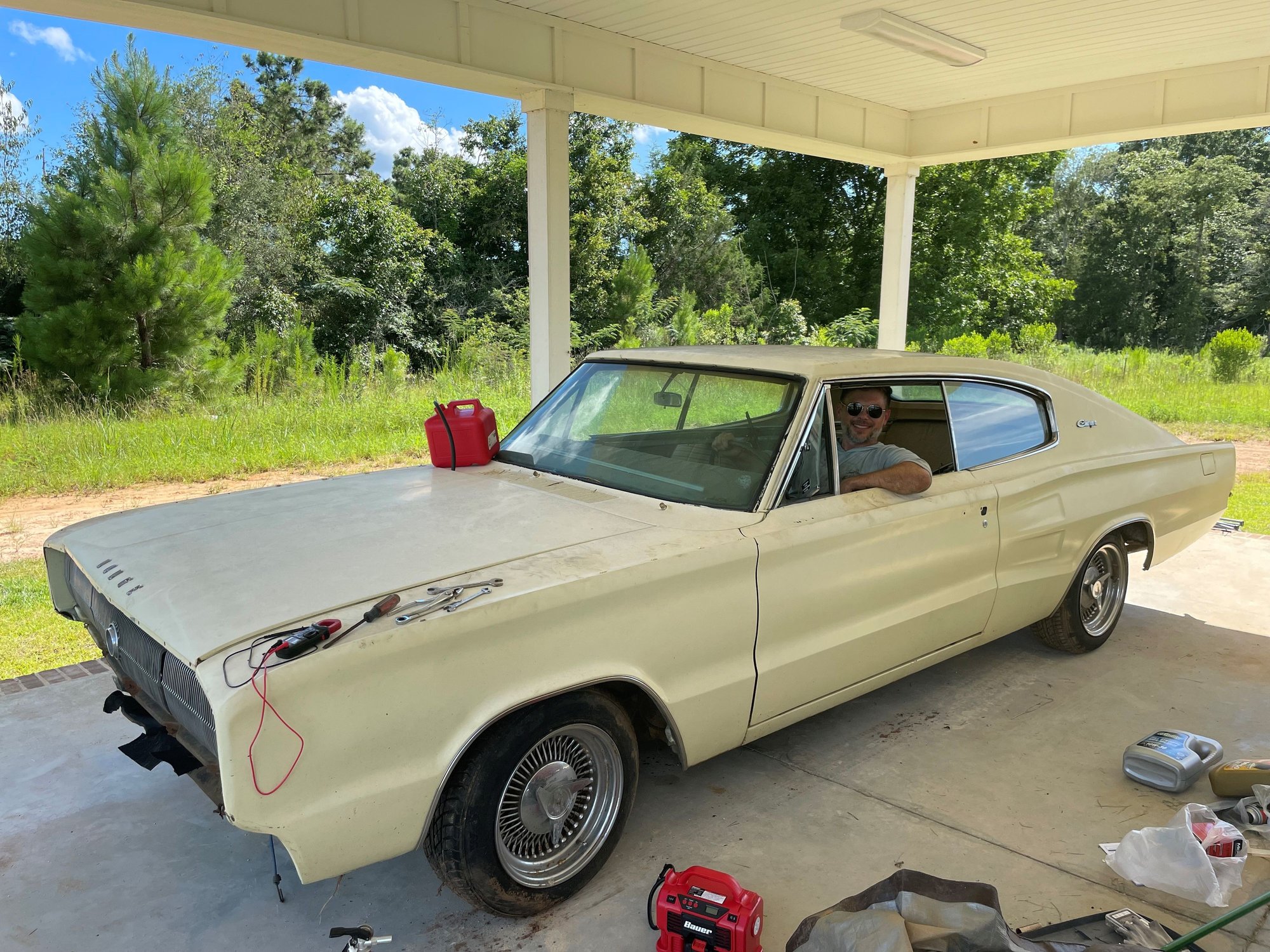 Saw a MP ad for a 1966 Dodge Charger in N Georgia. Car is very complete and original so I jumped on the deal. It does have a slightly later 383. The bill of sale has an E or F designator for the engine making it an original 318 or 361. So, almost glad to have the 383. This old gal needs lots but things like all interior lights work, headlights work. I have 50lbs of oil pressure on start up. Still needs sorting out. Wiring, cooling, carb adjustments, new tires, trim put back on, and a good deep cleaning. In 48 hours i have: