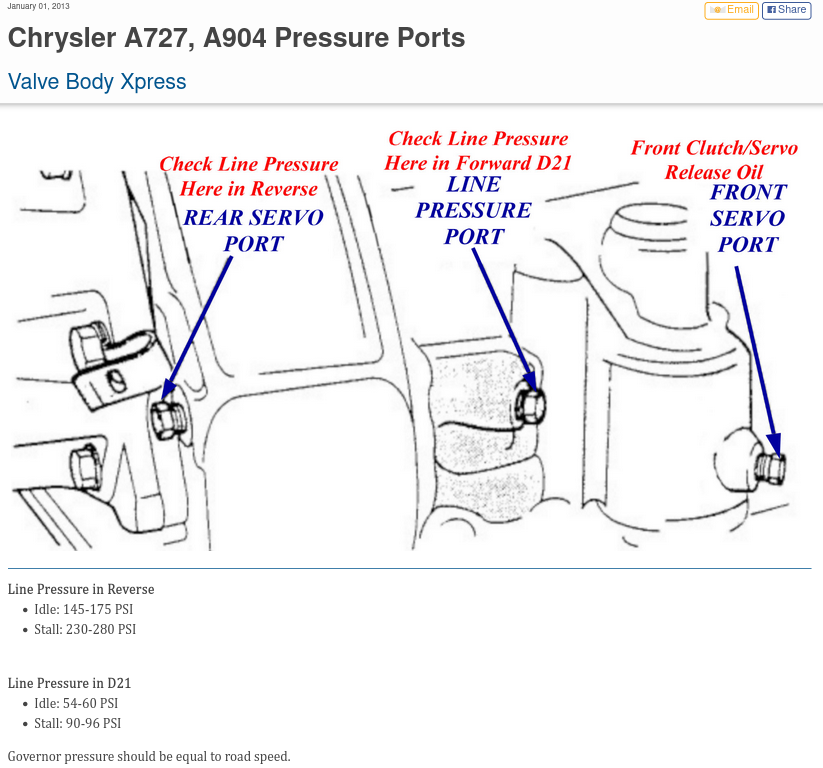 There are test ports for checking pressures on the TorqueFlite but, I've never done that. Maybe worth checking before dropping the pan for inspection and losing your fluid.