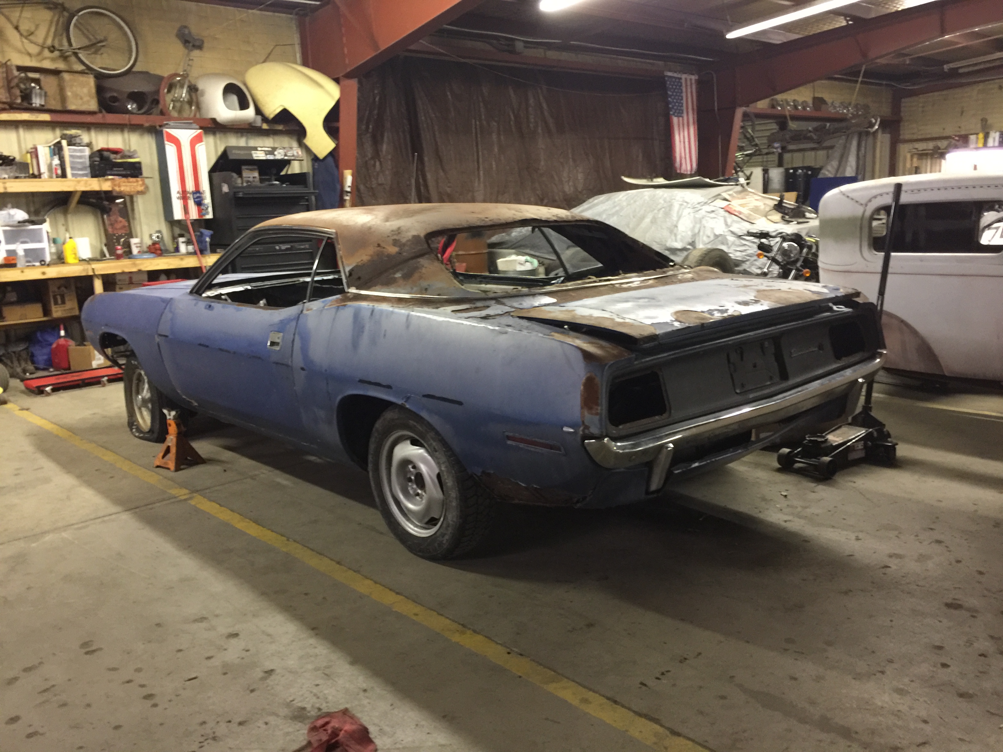 My name is Ben, I am a sophomore at McPherson College, studying Automotive Restoration. Recently I acquired a 1970 Barracuda, 383, 4-speed. It is in fairly rough condition as far as rust on the body, but all the supports seem to be solid, with the exception of the front frame rails which will need some work.