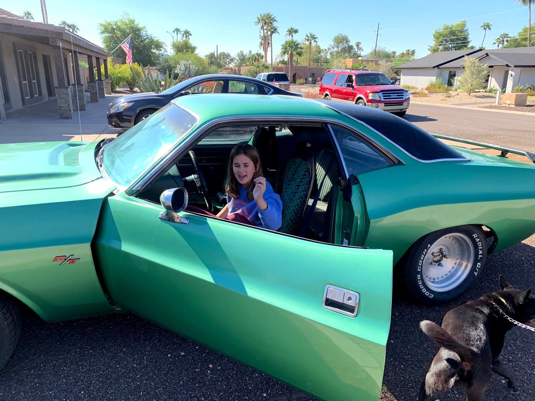 Here's a couple I took on the day my buddy helped me deliver it. My daughter is VERY jazzed about the car! It does run (383 bored out to a 426) with a pretty nice rumble. Originally a Canada car so does have some rust issues. Story goes that two brothers both bought Challengers and the RT became a bit of a donor to this car so the RT grill and other badging is kind of misleading. Although the color is a little funky (Frosty Green) I am kind of coming around to it & thinking of repainting the same color with black accent stripes minus the "RT" and black hood accent. Not sure about the vinyl top but if I redo it I am going to pull it forward. It does run & drive...actually got it to pass emissions just last night by leaning it out.
