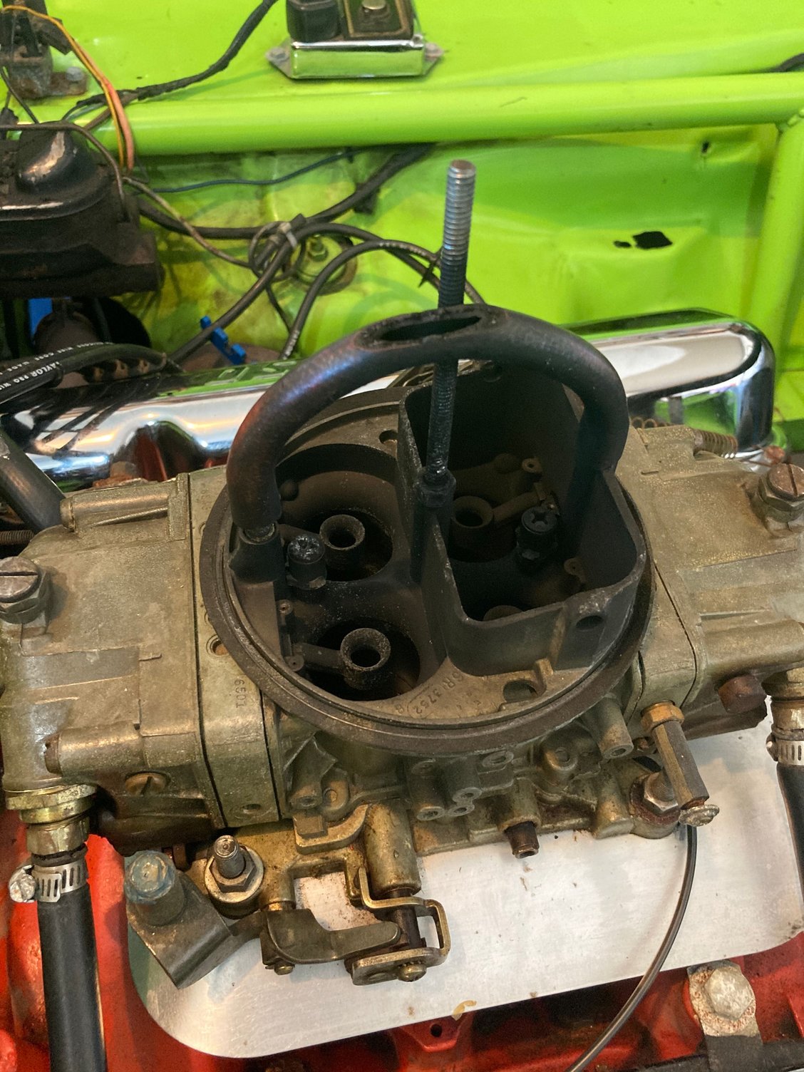 Driver Side View Passenger Side View Dirty Air Filter Yellow squiggles is where fuel was sitting on top of the base plate. Yellow arrow is where there was a constant fuel drip (even after the fuel pump was shut off). Yellow squiggles are where fuel was sitting on top of the base plate. Top view of carb. Why is there a black tube there?
