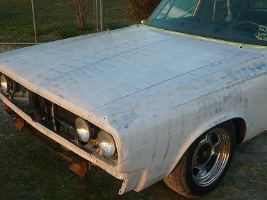 well i started the paint process today. Me and my brother got it all sanded down and layed down the first coat. Tomorrow we will be wet sanding then put on coat 2. This took all day today, its ALOT of work, especially removing all the chrome trim it has. Heres some pics of it now.