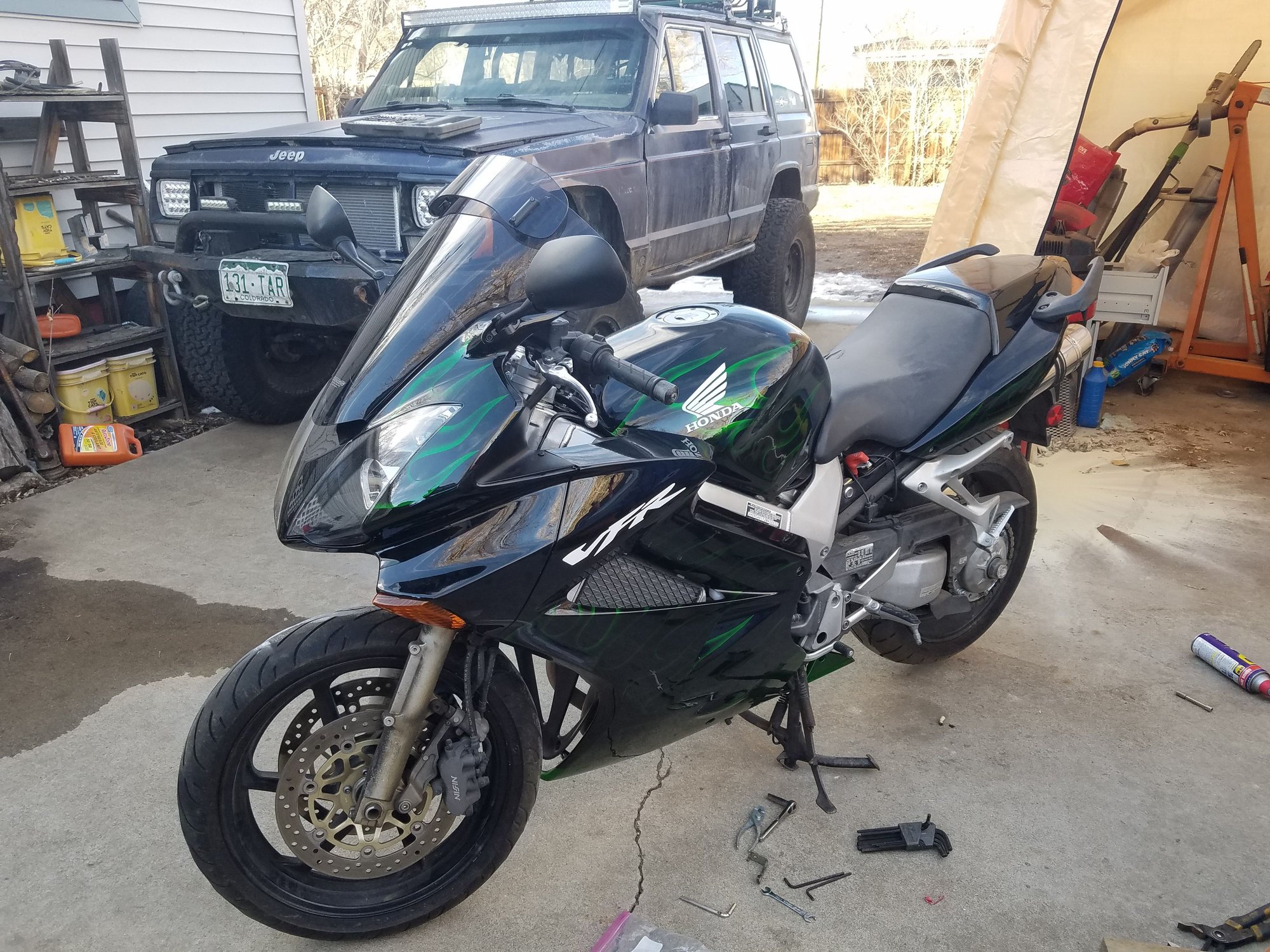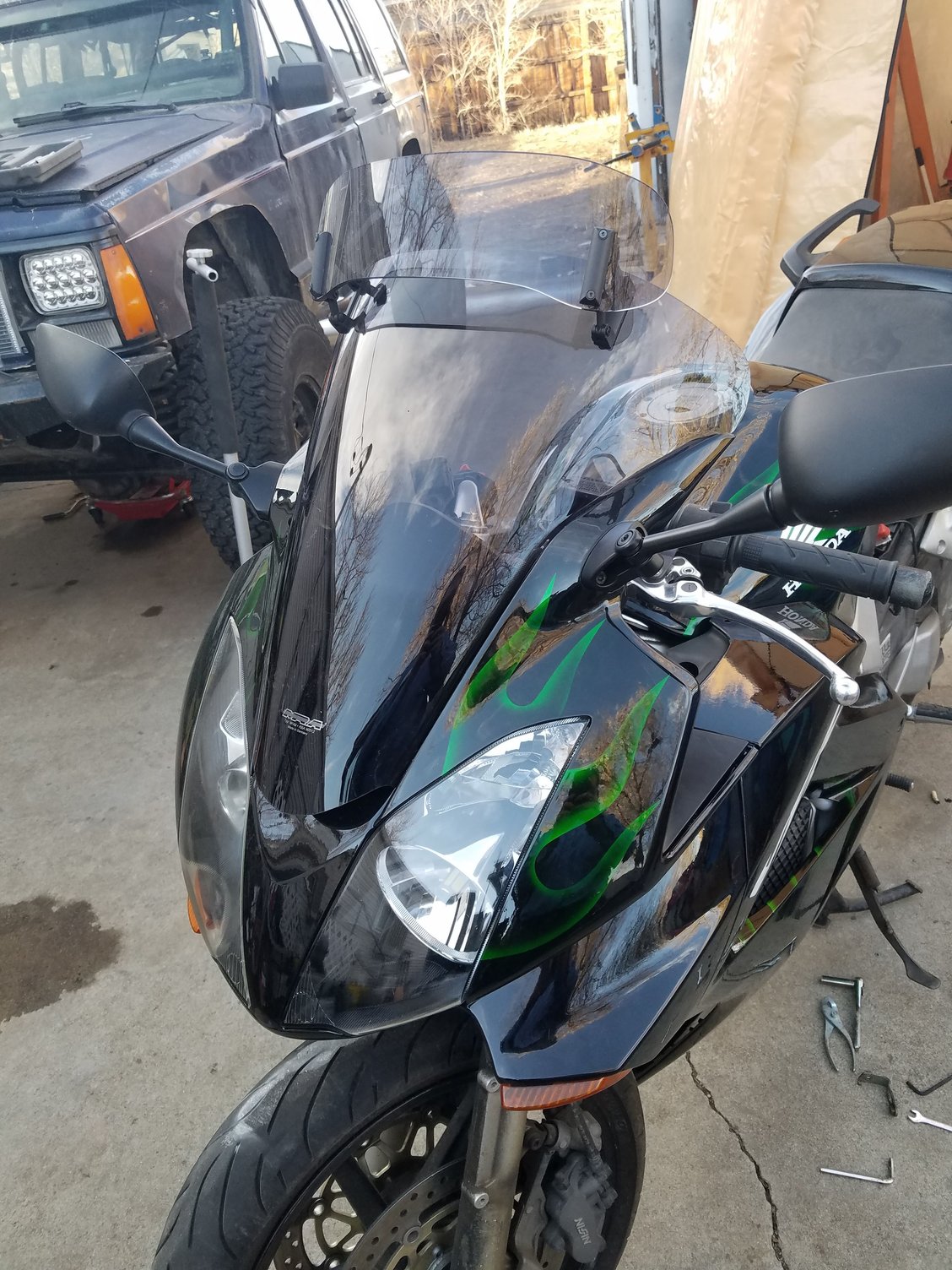 Not quite done yet but thought I would throw in a little before/after of bike. The new wind screen is bigger than original to help with wind and has additional piece that is adjustable, one pic it is down the other is all the way up. Apparently during freezing temps the bank sensor failed. Had tested bike while waiting on new fairing and it was working but after getting fairing and few other things done had no power to fuel pump. Bank sensor is under front fairing so it all had to come back off to access. Should have it back to street ready by this weekend.