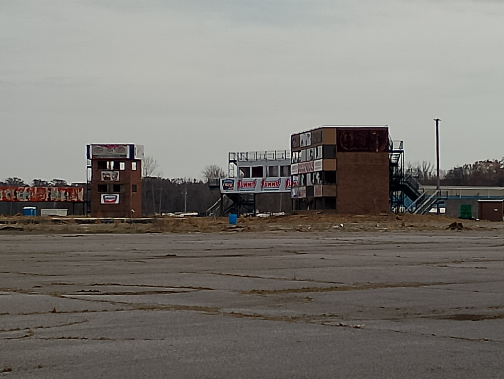 I've been itching to ride out to check on what's been done at the racetrack since they made the big announcement so I headed out this morning. They've done some demo, taken down most of the poles, the ticket office, snack bar and oddly enough they appear to have removed the retaining walls; maybe to make repaving the track surface easier? The offices, timing tower and VIP suites are still standing. Looks like they've got a lot to do to get it in race trim by September. See what I did there? They also bushogged the parking lot / field, I guess so people who drive by can see what's going on.