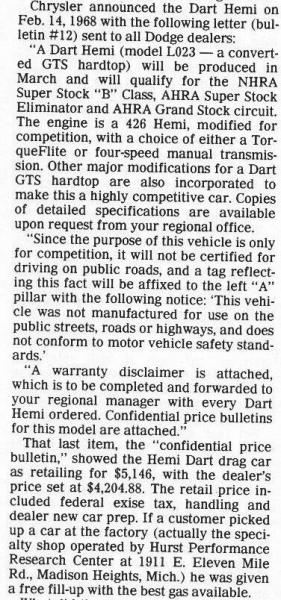 There were hemi Darts and B-cuda's in 68 they were not sold for street use, race only and no warranty. I have a pic or two somewhere, I;ll look for them.