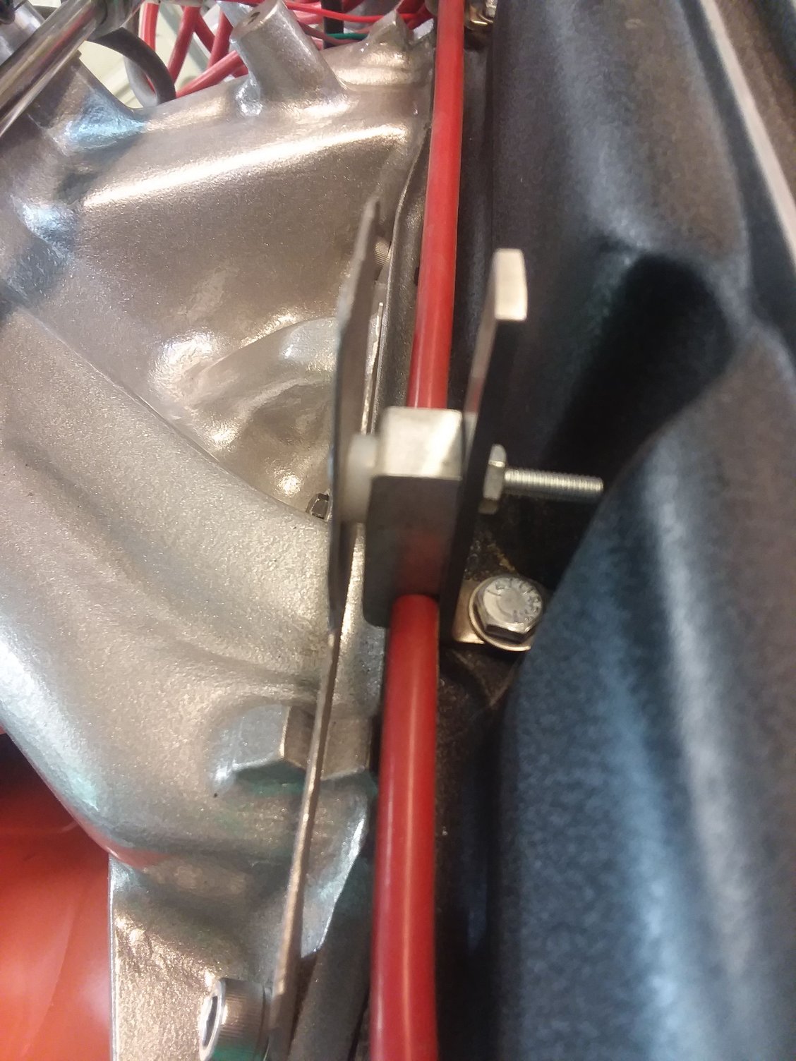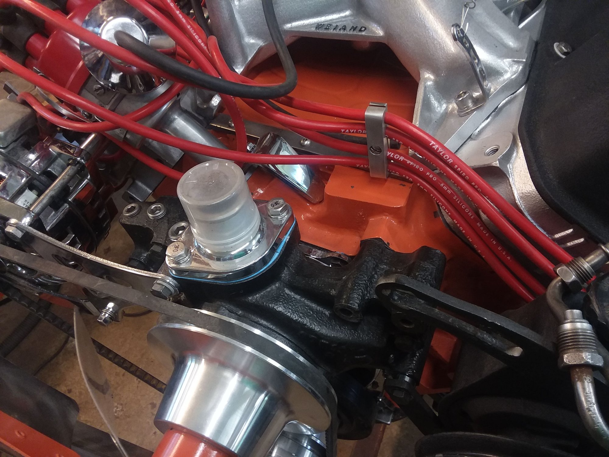 I also cleaned up the plug wire routing for the ones that pass behind the alternator. I took the power steering pump loose and narrowed the various spacers to better align the pulley with the crank pulley. Custom coil bracket mock up. White nylon spacer as stand off. I like a neat and tidy engine bay. Corralled and out of the way.