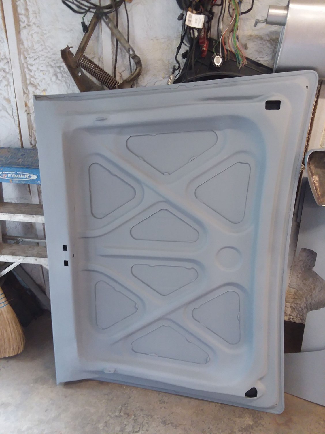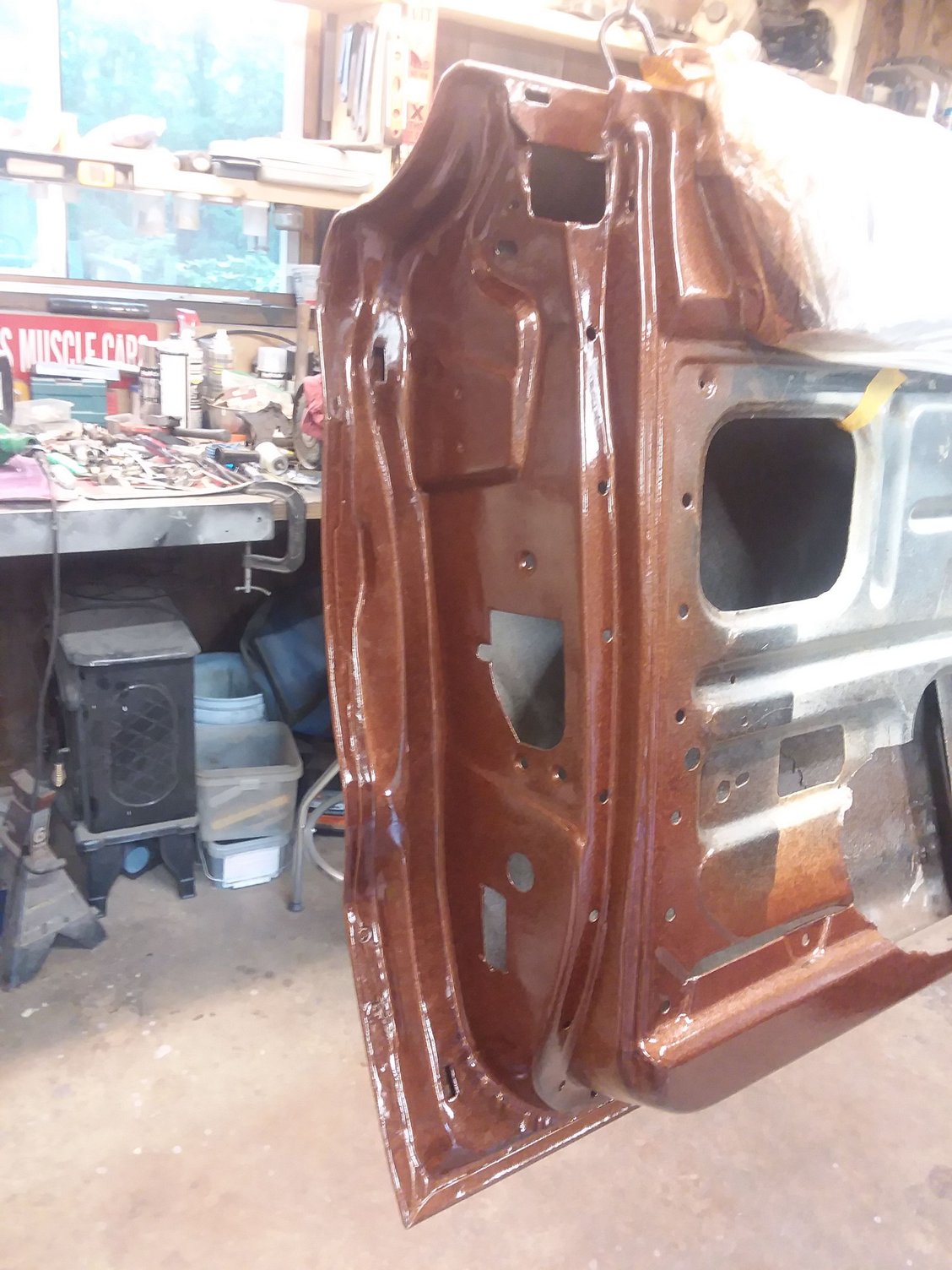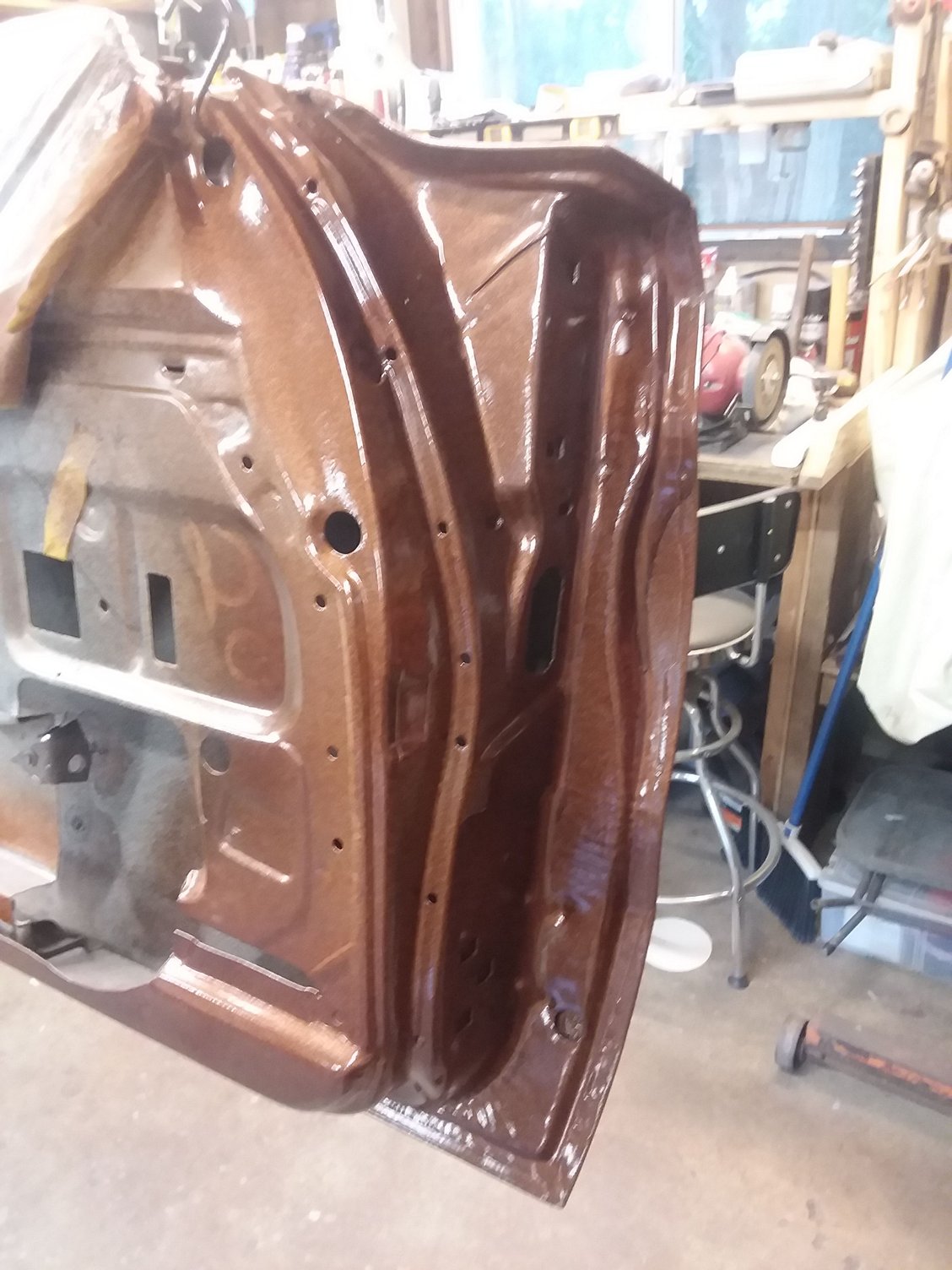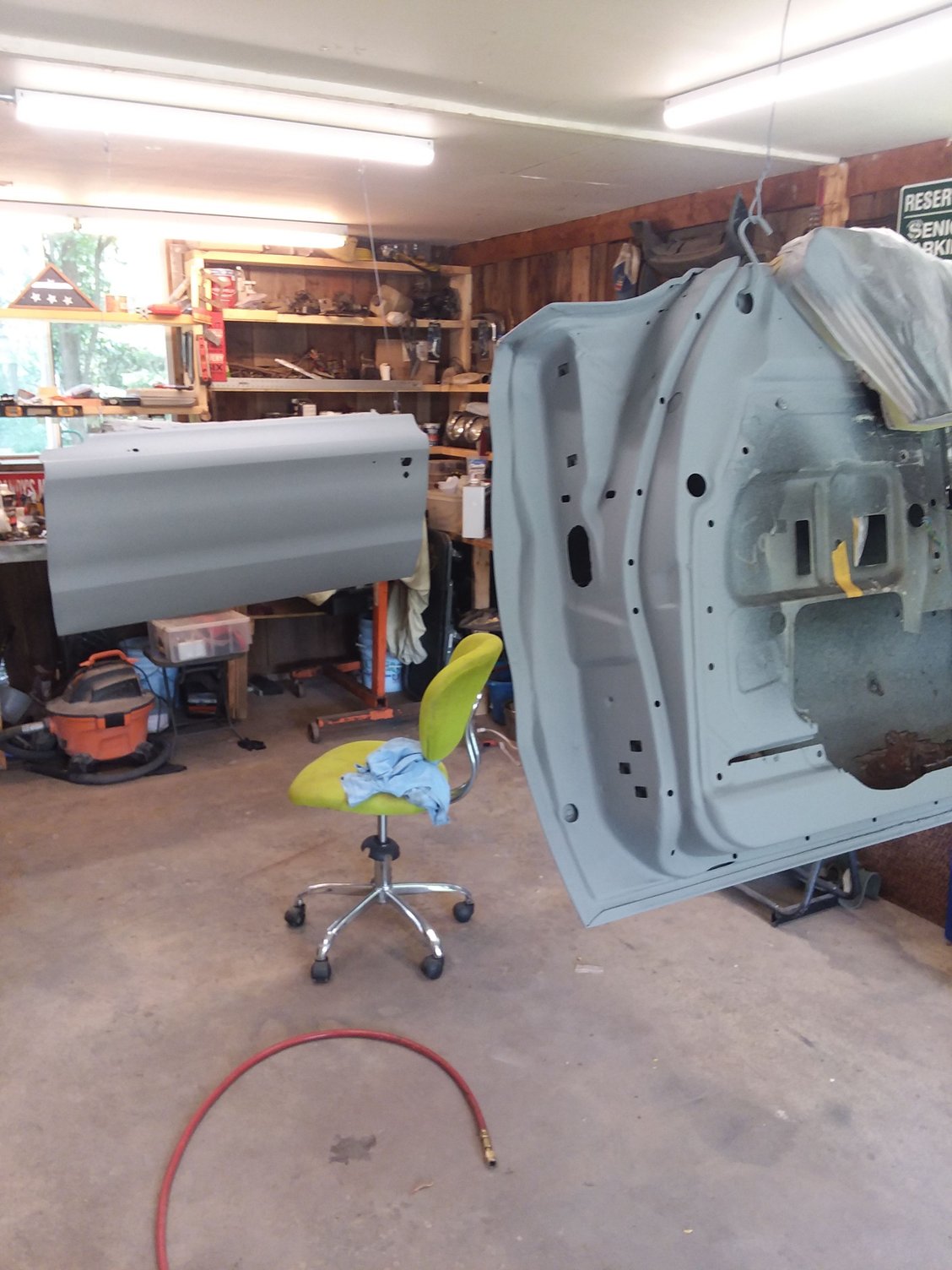 Shot the trunk lid and hinges today and the inner fender panels. Hung the left door and fender. Spent a lot of time getting those 54 year old panels to line up right and have good gaps.