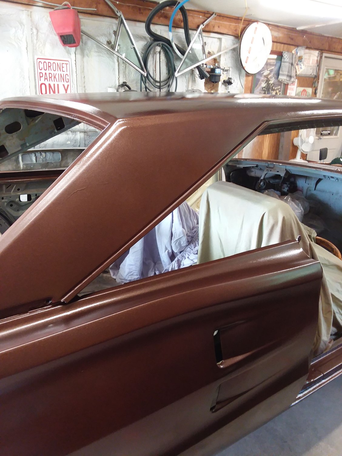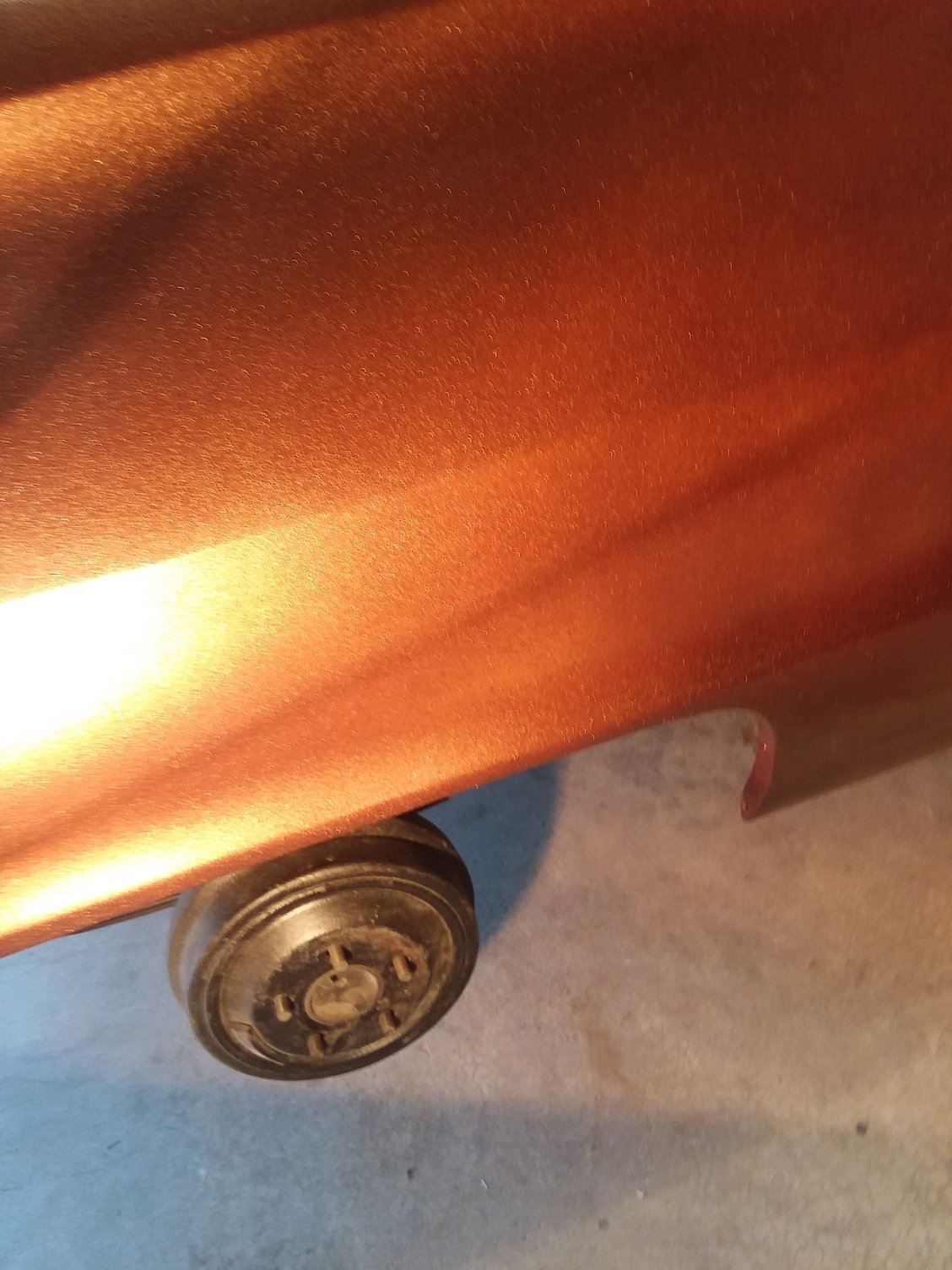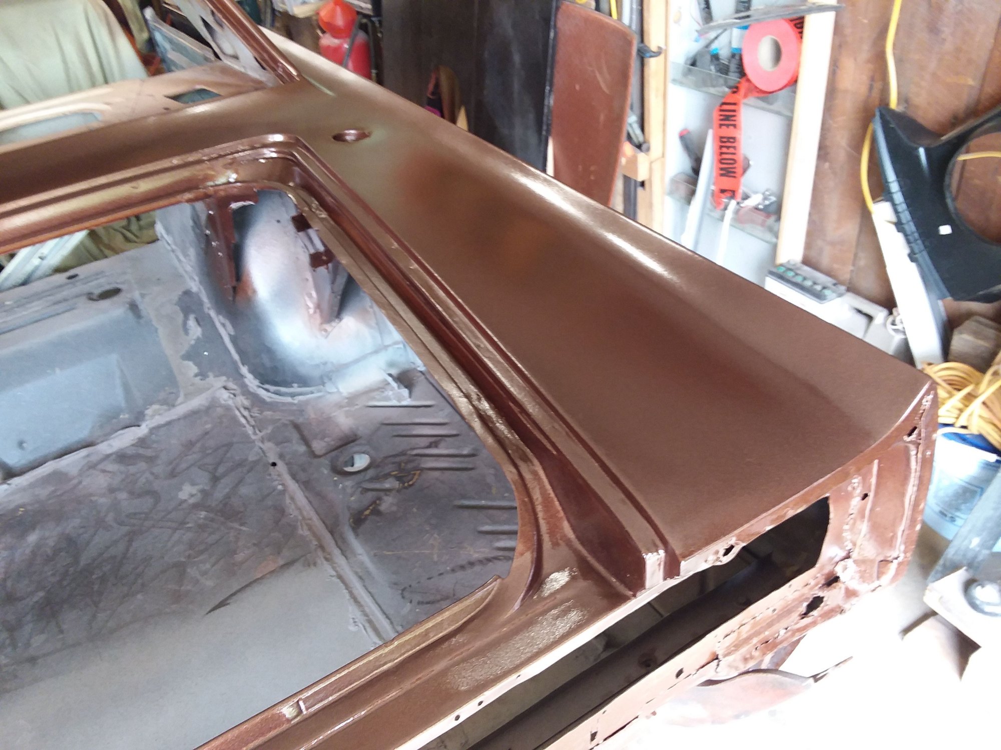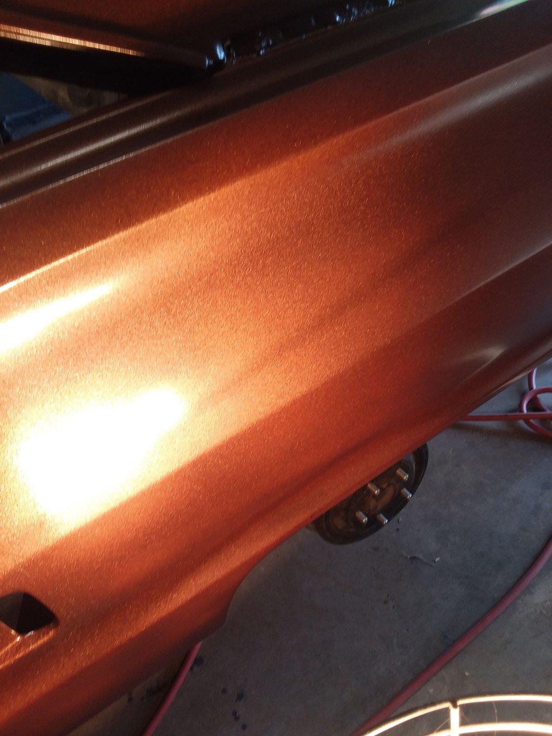 Got a few runs and a splatter plus some blotchiness but it isn't done yet. I need it to lay down and get it outside in the sunlight to assess the problems. Went better than I expected it to though. I'm sure the roof needs another even coat and I can't tell on the rest in the dark garage. I think it will be stunning in the full sunlight...