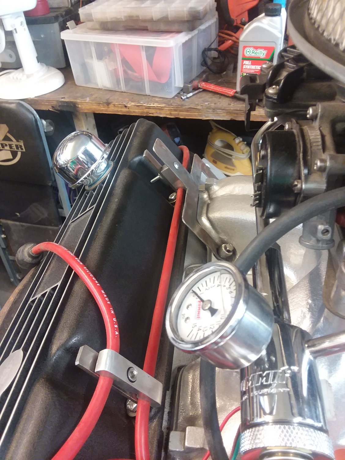 Working today on some small jobs that would be harder to do after the engine is installed. Routing the #8 plug wire around behind the cylinder head and along the valley/ manifold area and the coil wire and coil. I made a custom bracket to mount the coil along the rear of the passenger side valve cover. I placed a spacer behind the mounting tab between it and the plug wire loom clamp to leave room for the coil mount bolt nuts. The coil mount still needs a little fine tuning and paint.