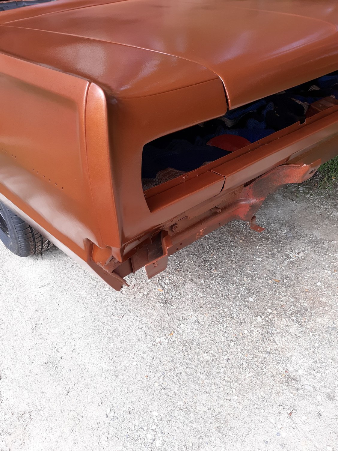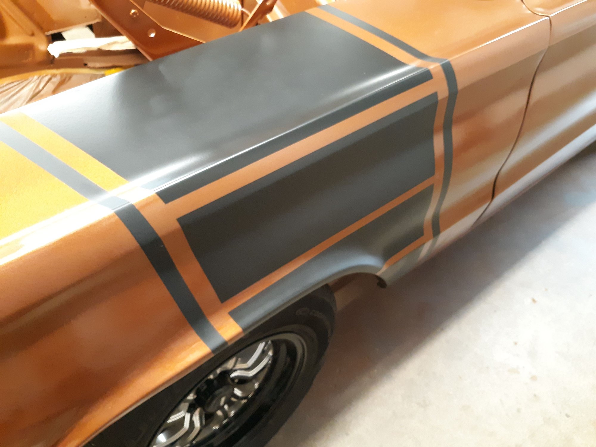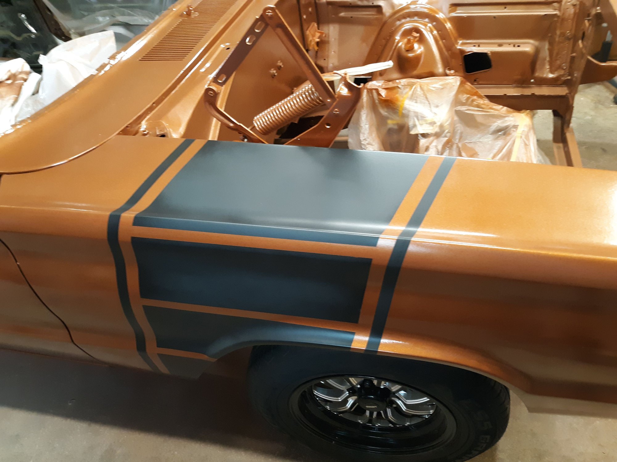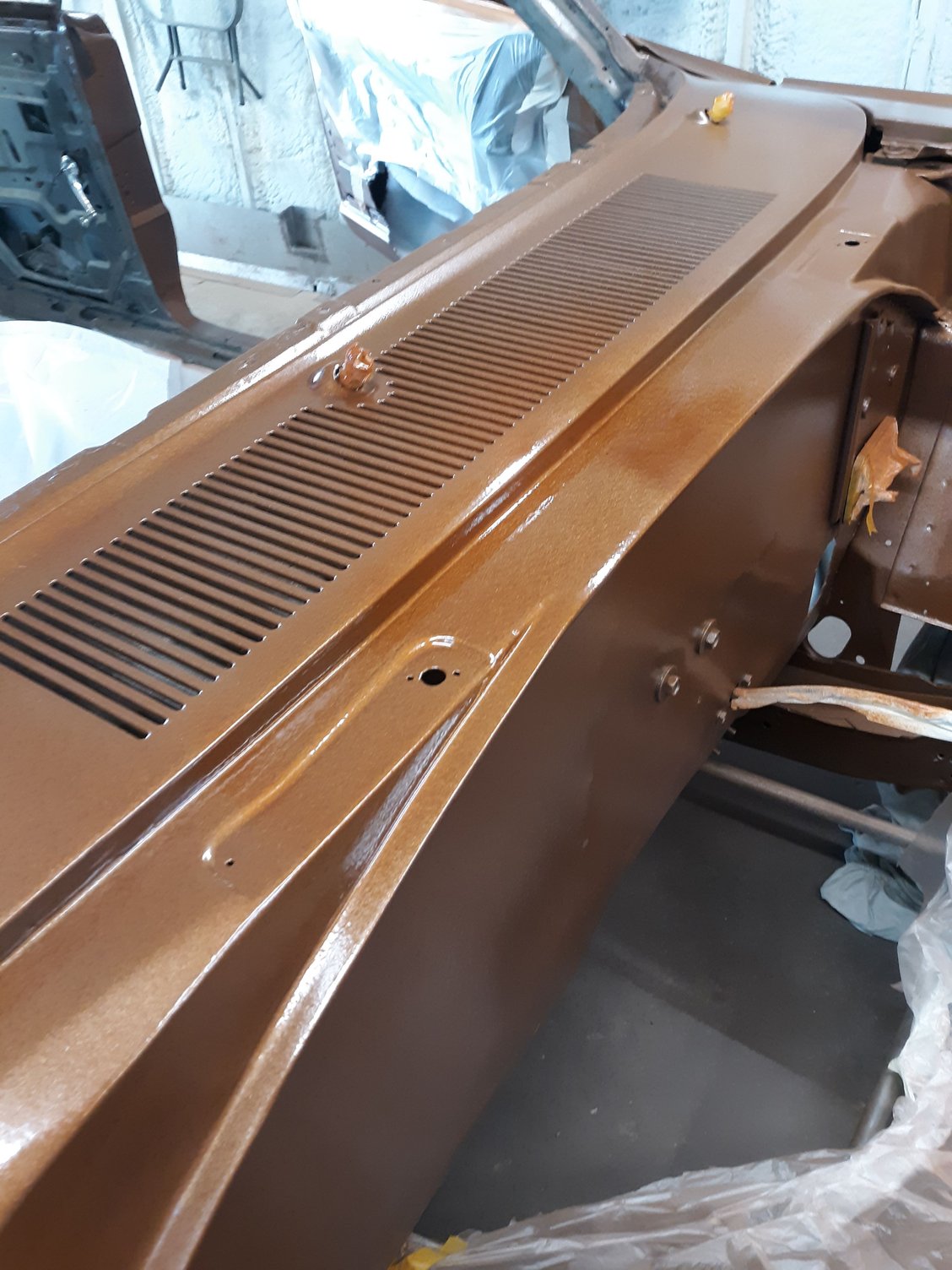 Repainted the car in Copper Metallic AU. Painted the strip package on both fenders. Painted and bolted up the hood hinges after having them sand blasted.