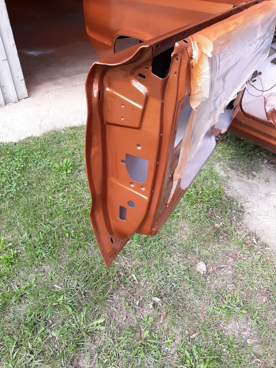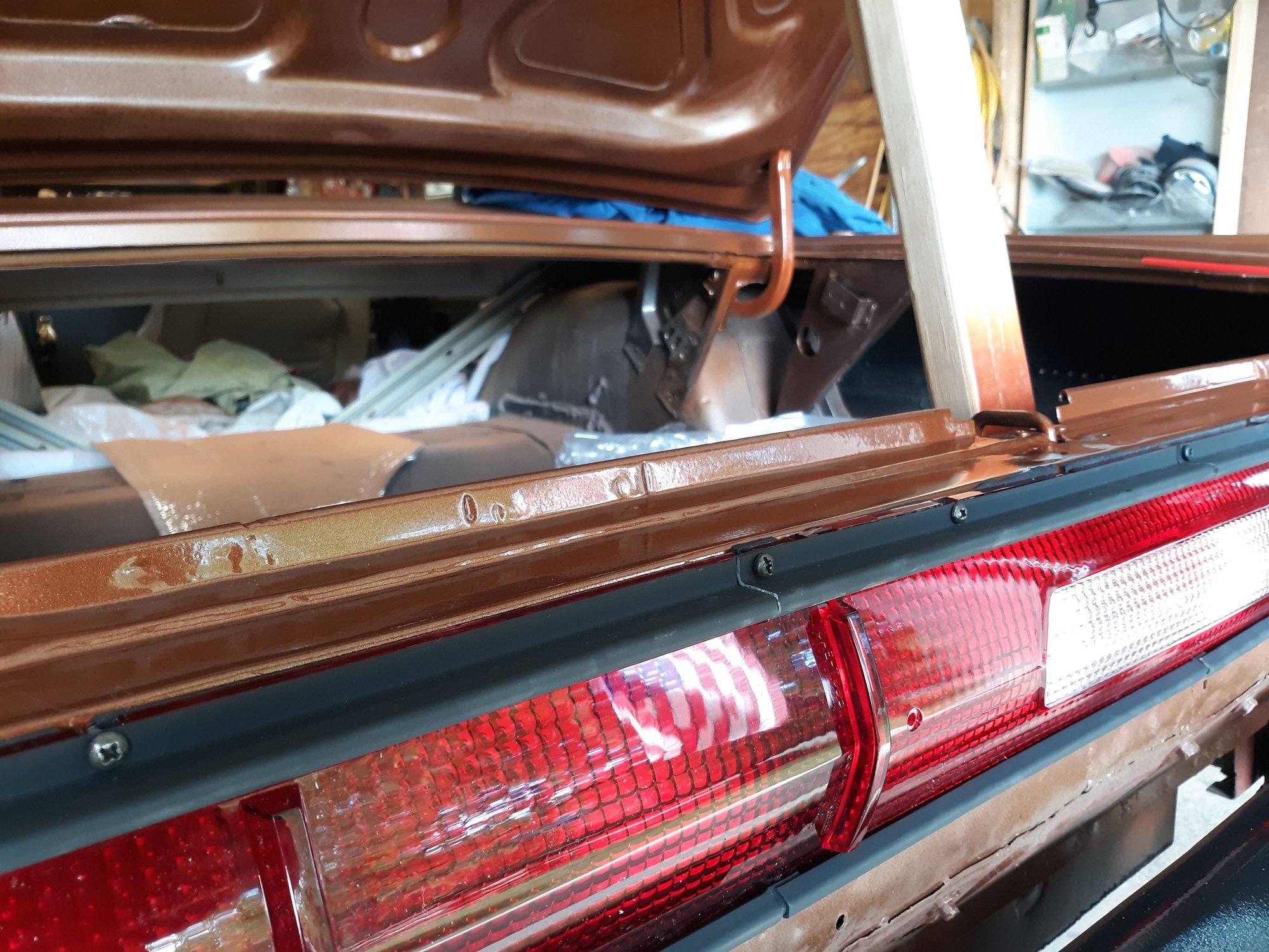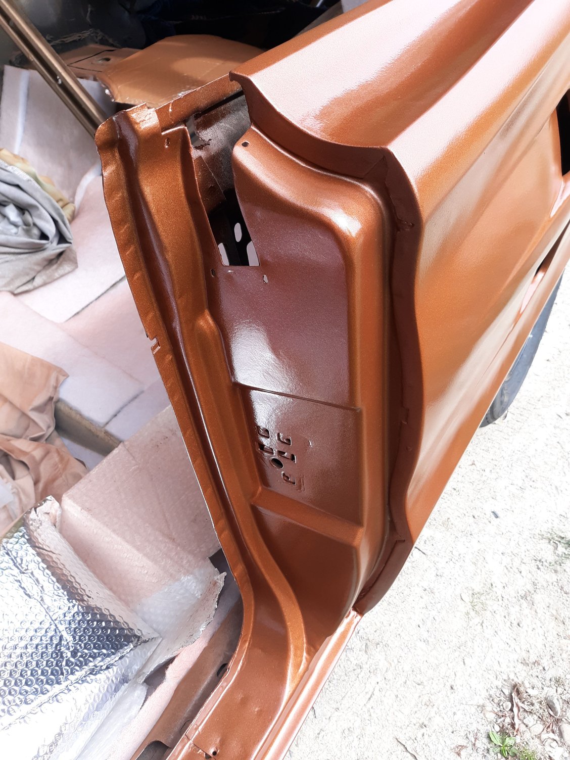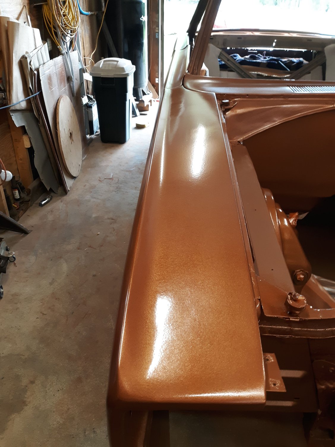 Repainted the car in Copper Metallic AU. Painted the strip package on both fenders. Painted and bolted up the hood hinges after having them sand blasted.