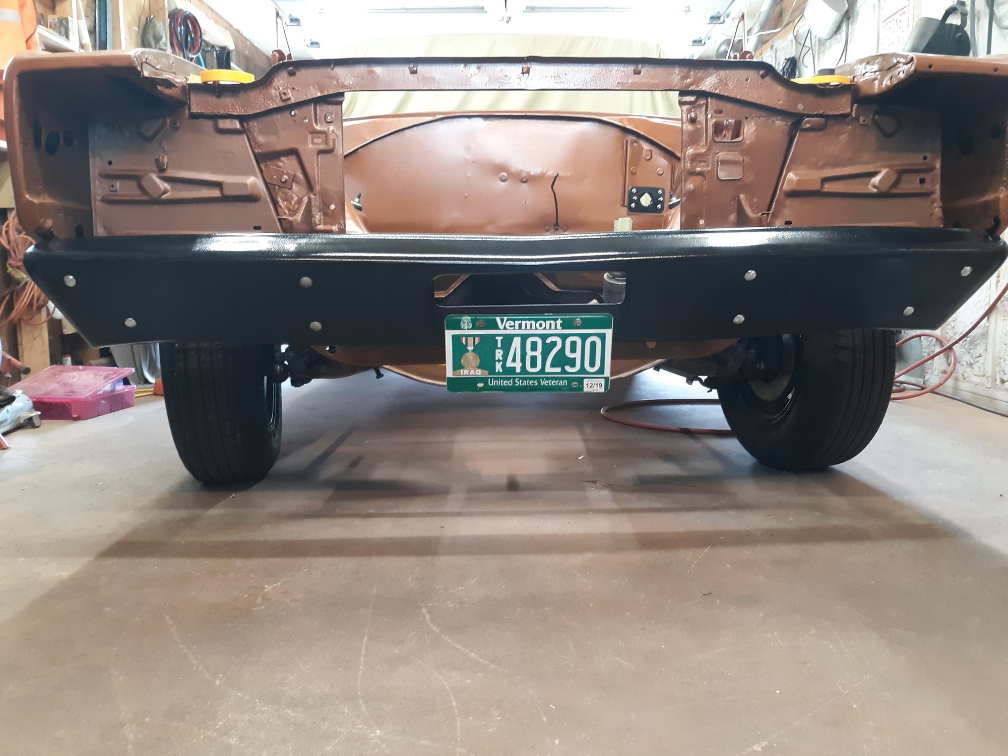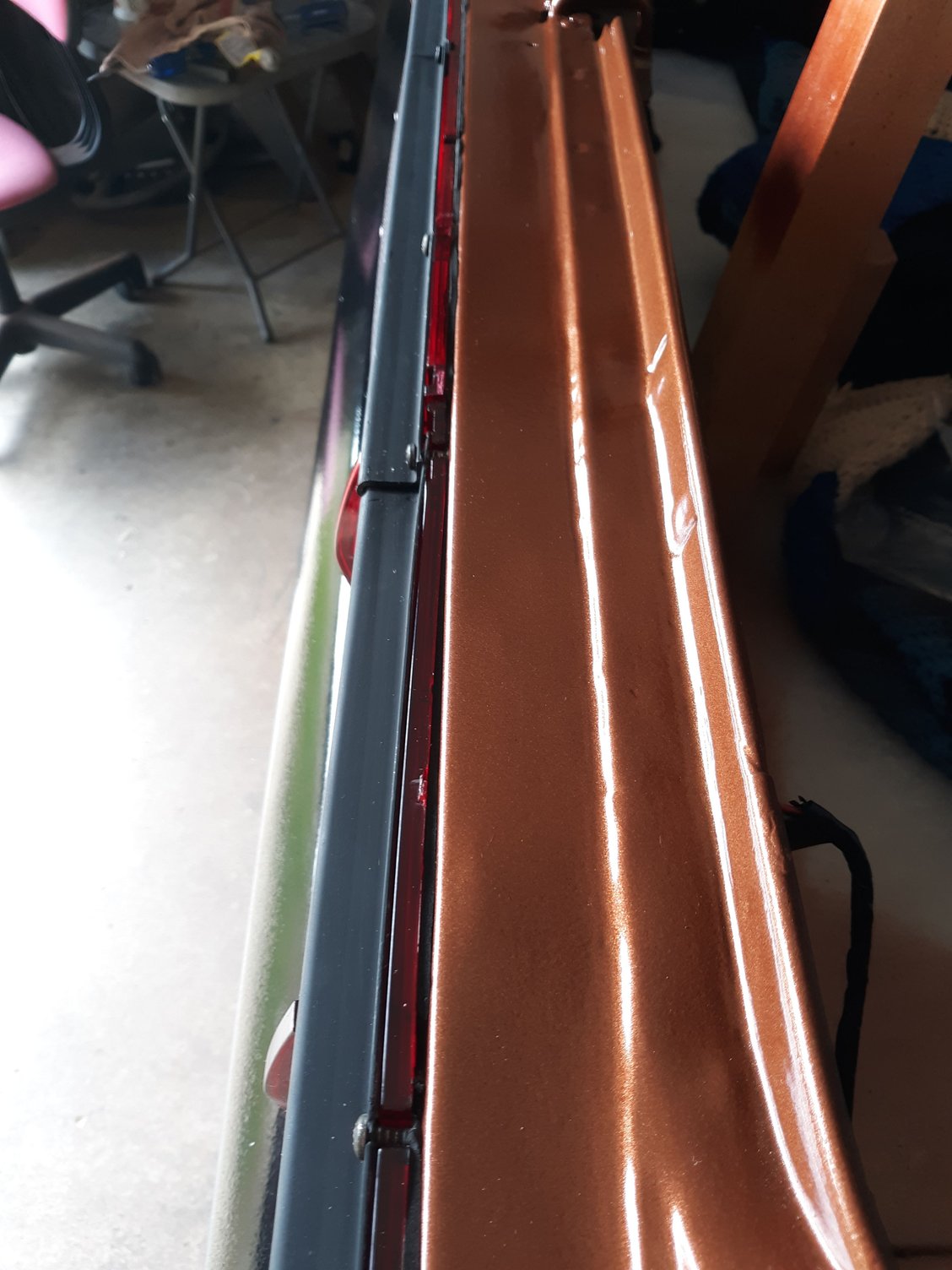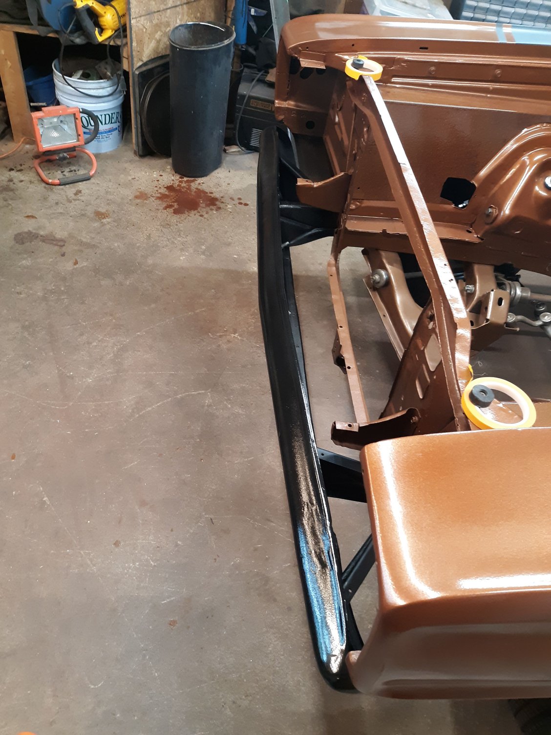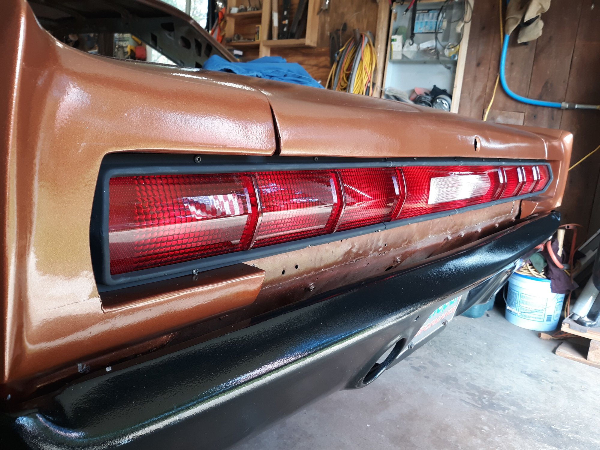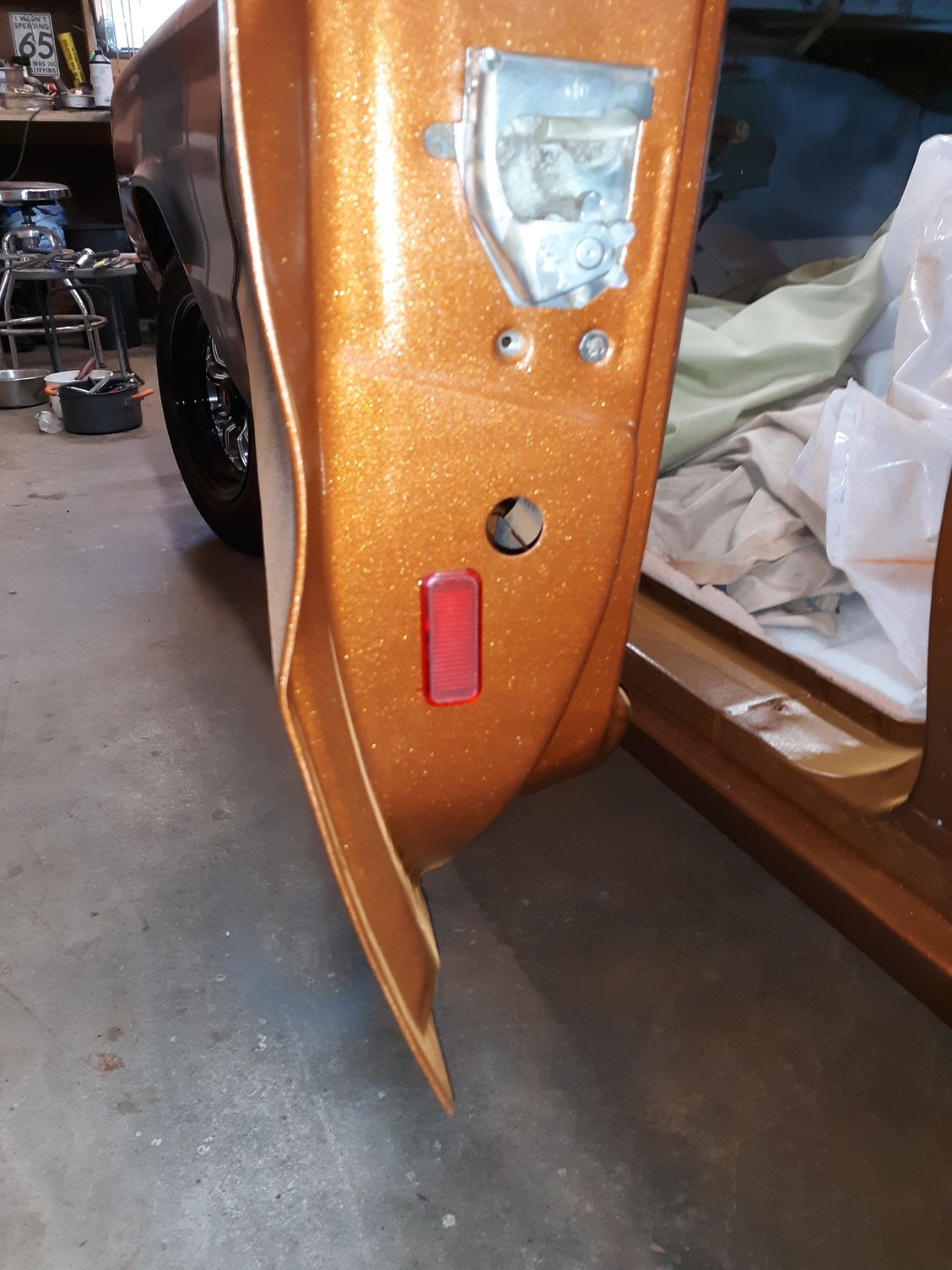 Repainted the car in Copper Metallic AU. Painted the strip package on both fenders. Painted and bolted up the hood hinges after having them sand blasted.