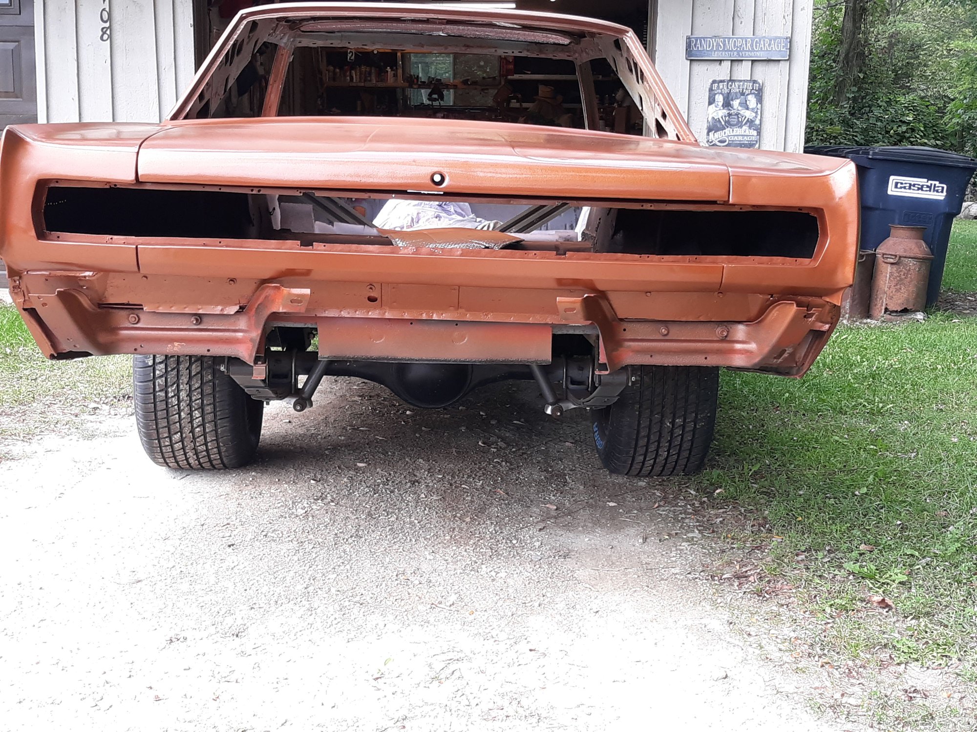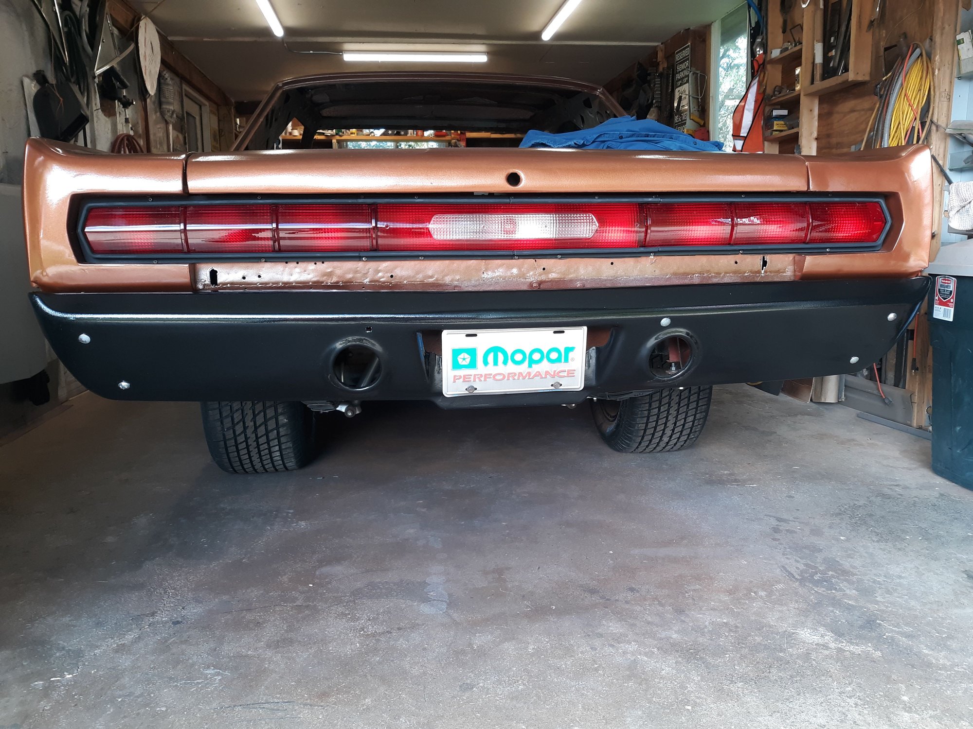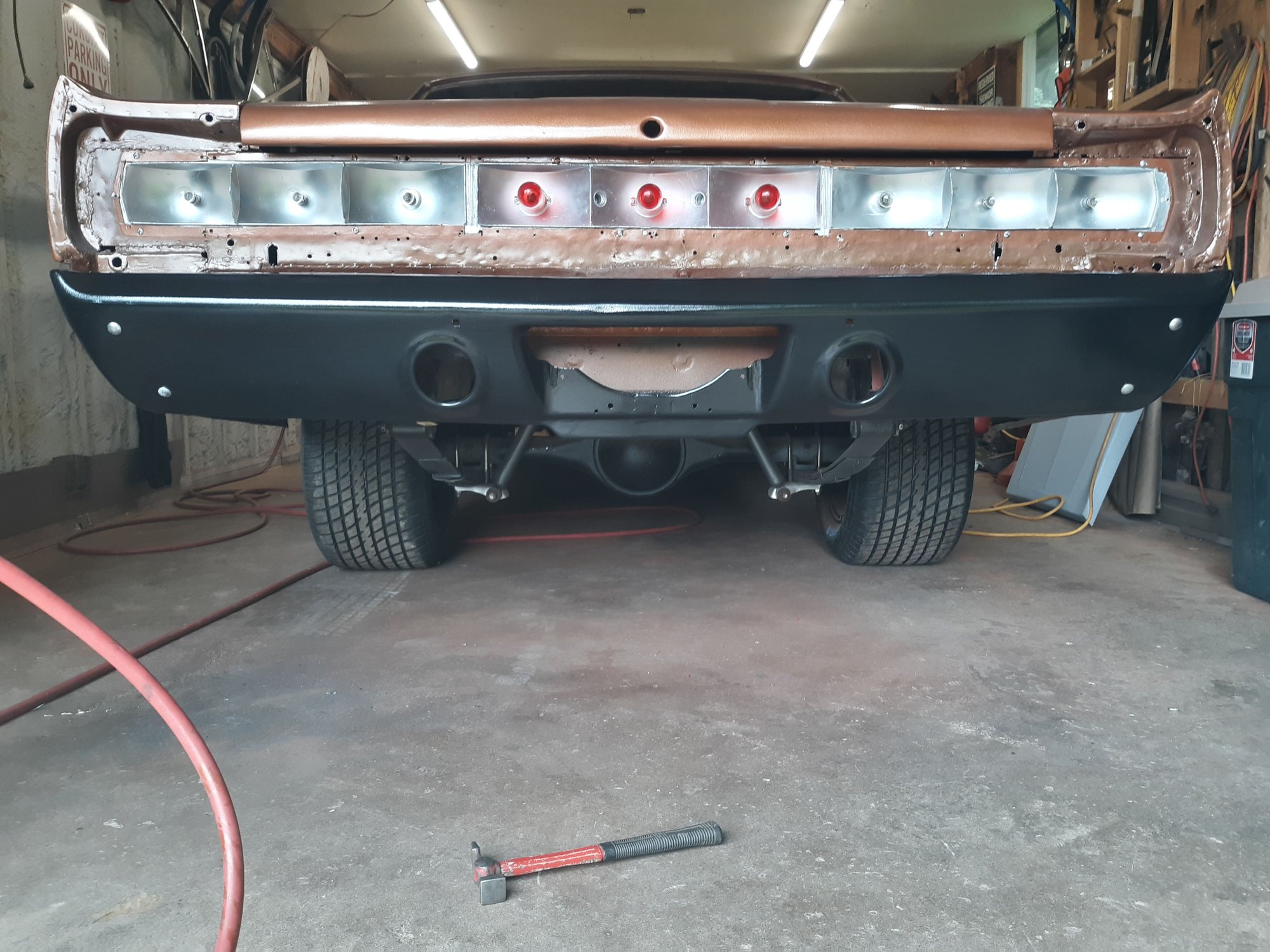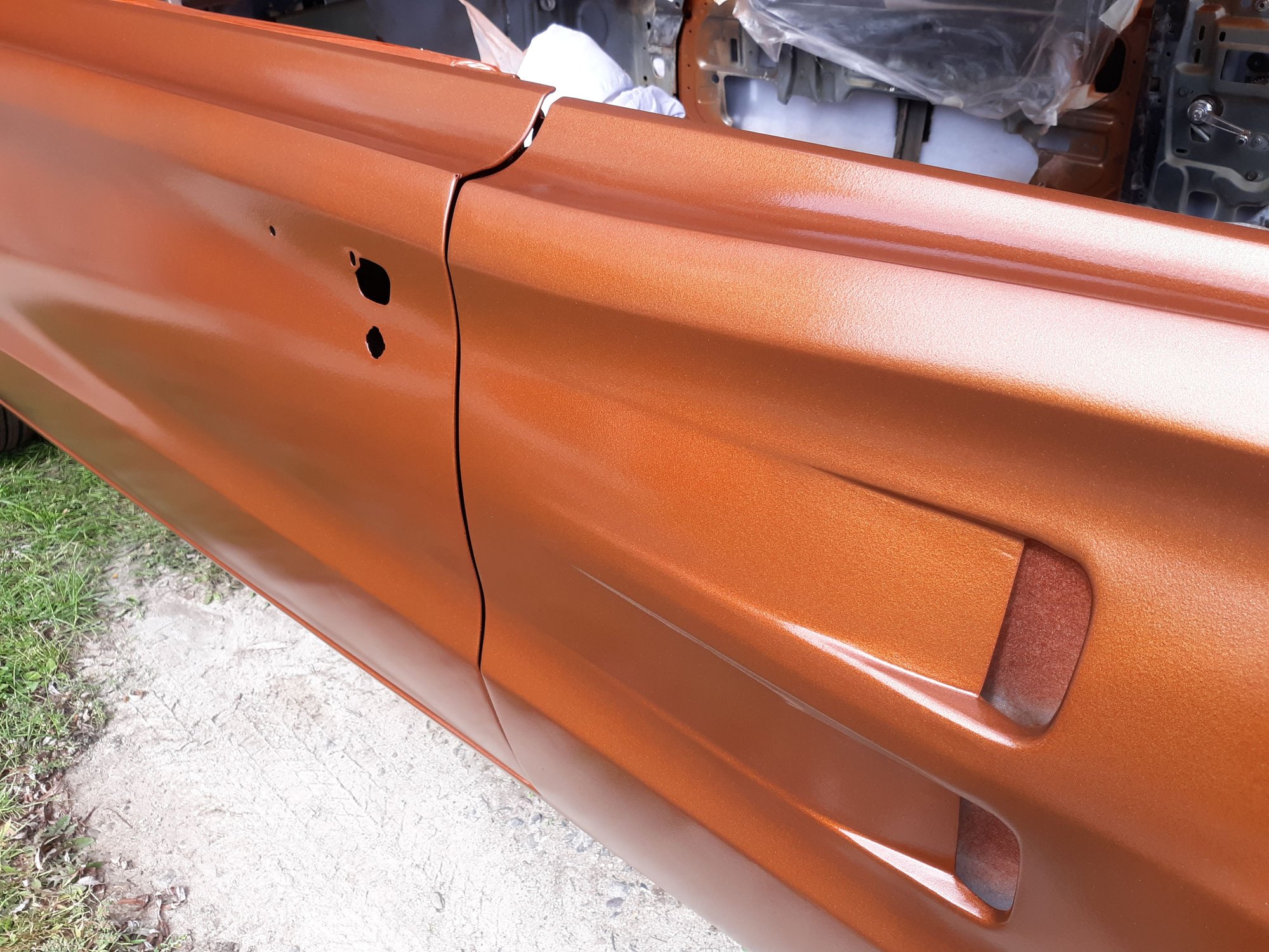 Repainted the car in Copper Metallic AU. Painted the strip package on both fenders. Painted and bolted up the hood hinges after having them sand blasted.