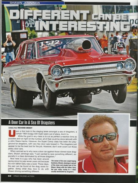 Thanks guys...I'm Shawn's brother, Jason. I'm his biggest fan. He is well deserving of the article. He has worked hard and spent a great deal of money to get the Dodge in the 8's! Heading to Tulsa this weekend, hopefully to run some 8.60's!