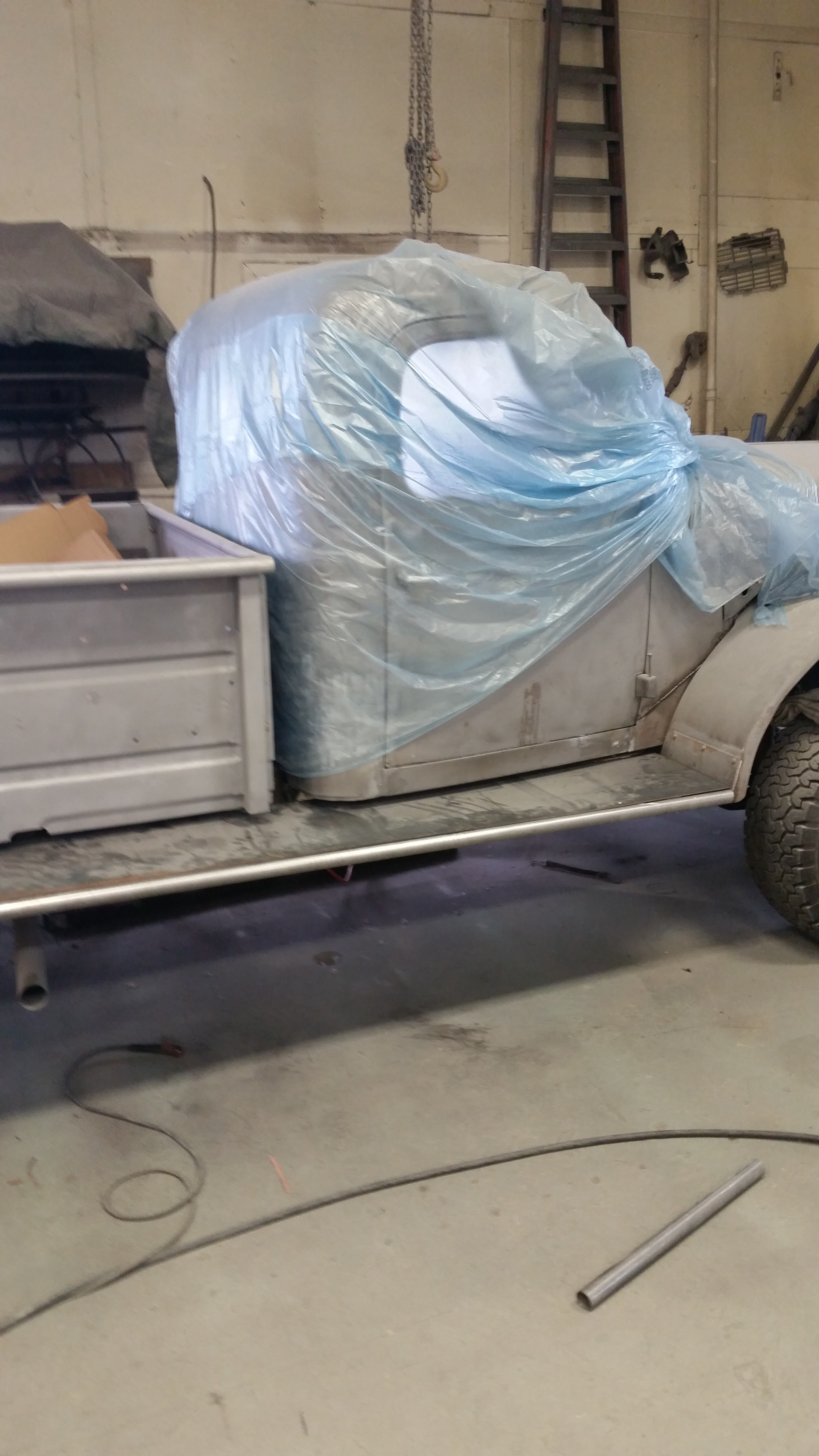 Covered to keep dust off new seats. Sat and talked with shop owner today. Things have really slowed down. Won't be finished on planned schedule. They have many regular clients that must be serviced and shop is short-staffed. Dennis, while he has his new leg, is not ready to come back yet. They are looking at bringing in an experienced body man when mine gets stripped down. The guy who has been working on mine is good at fabricating. He has done all the custom work on the PW. He can do bodywork, but by his own admittance that is not his really strong suit. I've blown through my budget big time. But the shop owner is going to allow me to carry a balance. Not only will he do that, but he isn't going to charge interest nor will he put a lien on the vehicle. As he said to me, "I don't look at you as just a customer anymore, but as a friend. And a handshake is all it takes." Hard to find guys like him anymore.