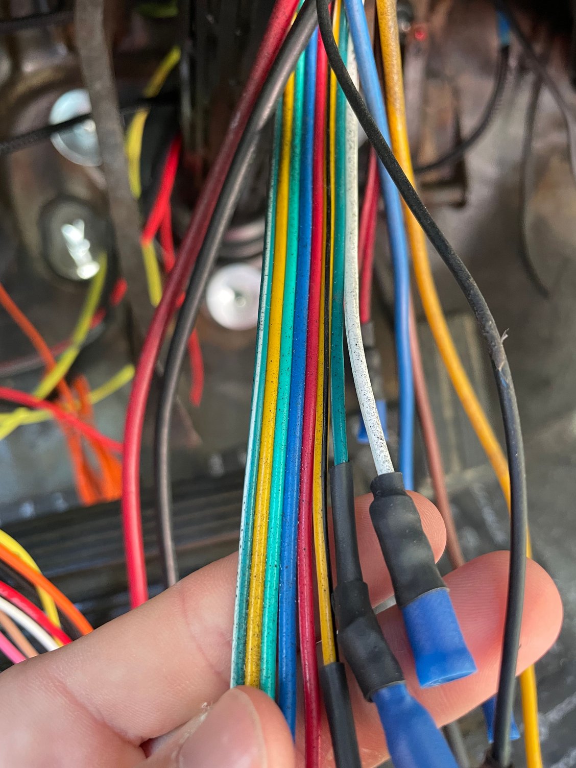 The 5 main ignition wires are done, but the cluster the picture focuses on is what we’re struggling with. We know they’re indicator/accessory wires but have no color code for them. They seem to be a different patter than anything we’ve found online or in the field service manual.