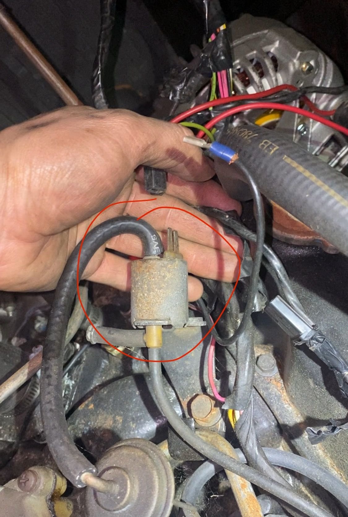 Do you know if the solenoid is open when not energized, allowing vacuum and opening the egr valve? My hypothesis is that the 12v that should have been going to the field windings of the alternator was the energizing the solenoid and closing the egr, making the engine run smoother at idle.