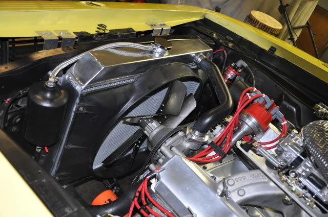 I was running a Afco 22" core aluminum radiator with a 2400 cfm flex-a-lite pusher fan ,and a 17" flex-a-lite 5 blade fan. With all that my car still ran to hot,and the 65 amp alternator was worked to its limits even with a relay.