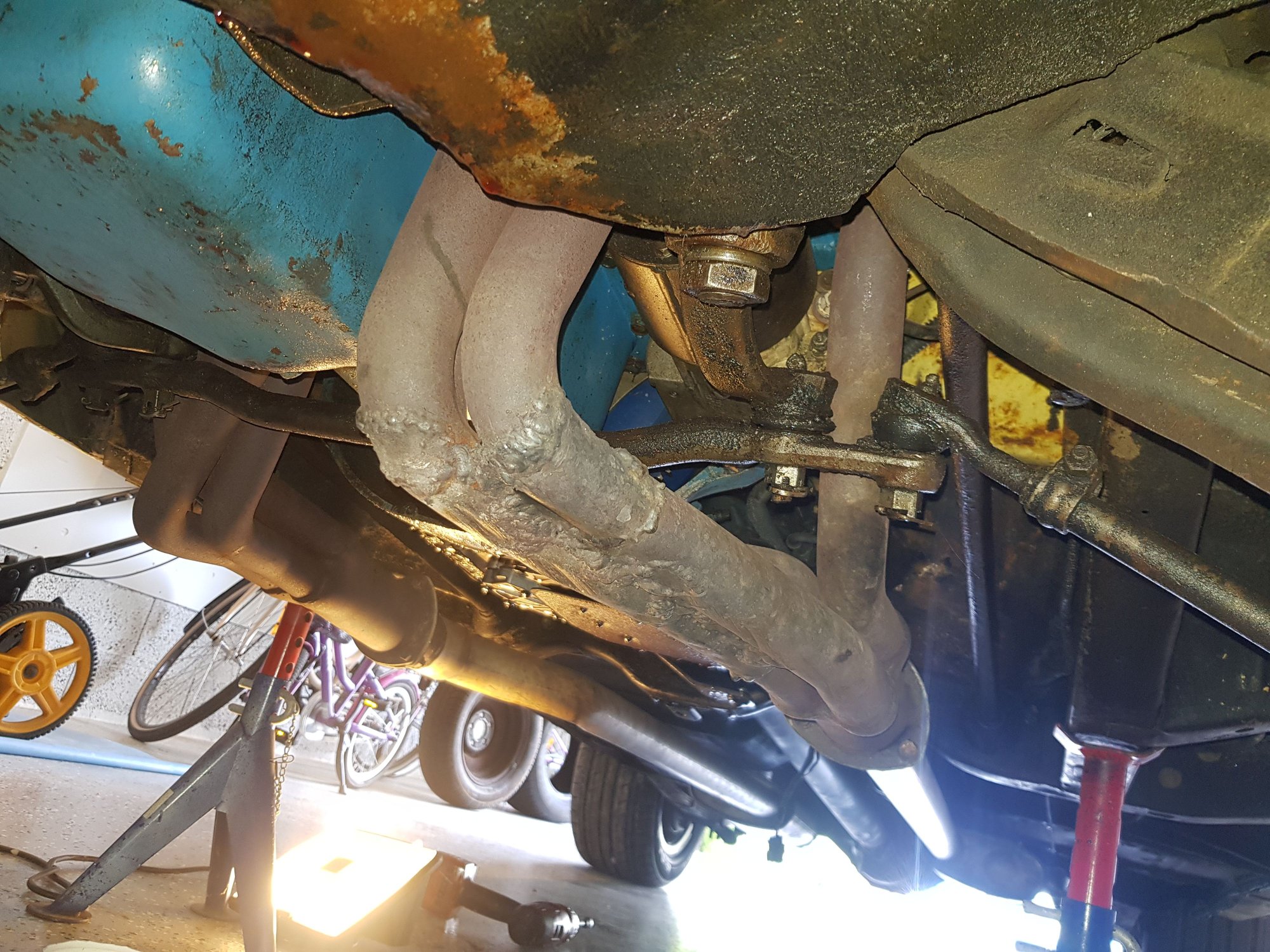 The Exhaust manifoldon the left side is low and goes under the front beam.
