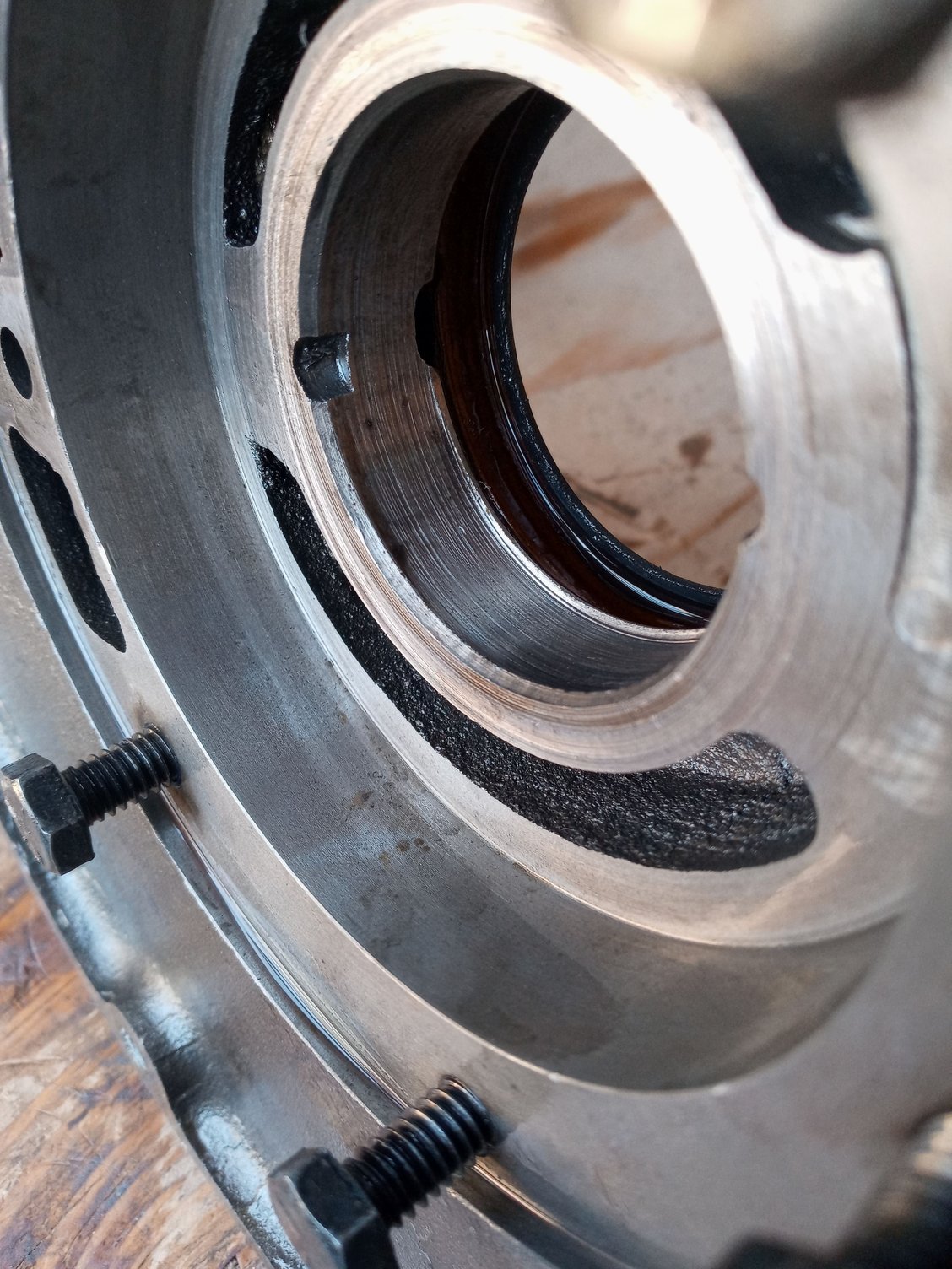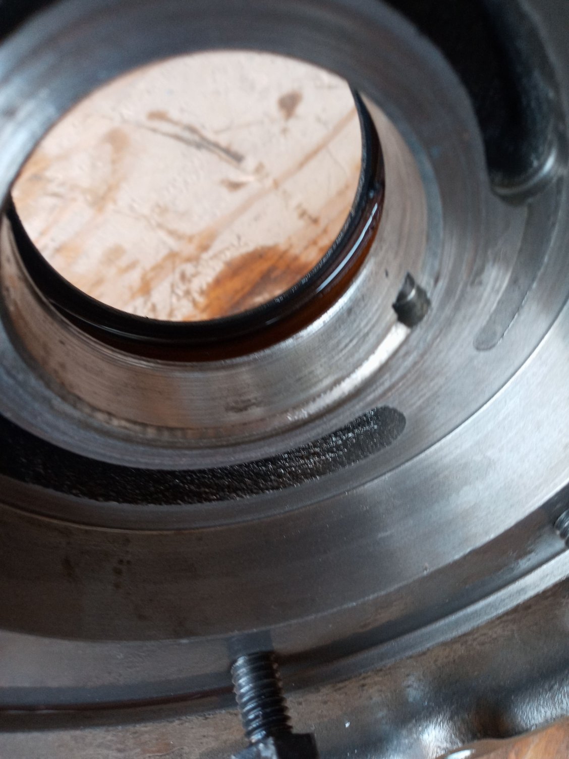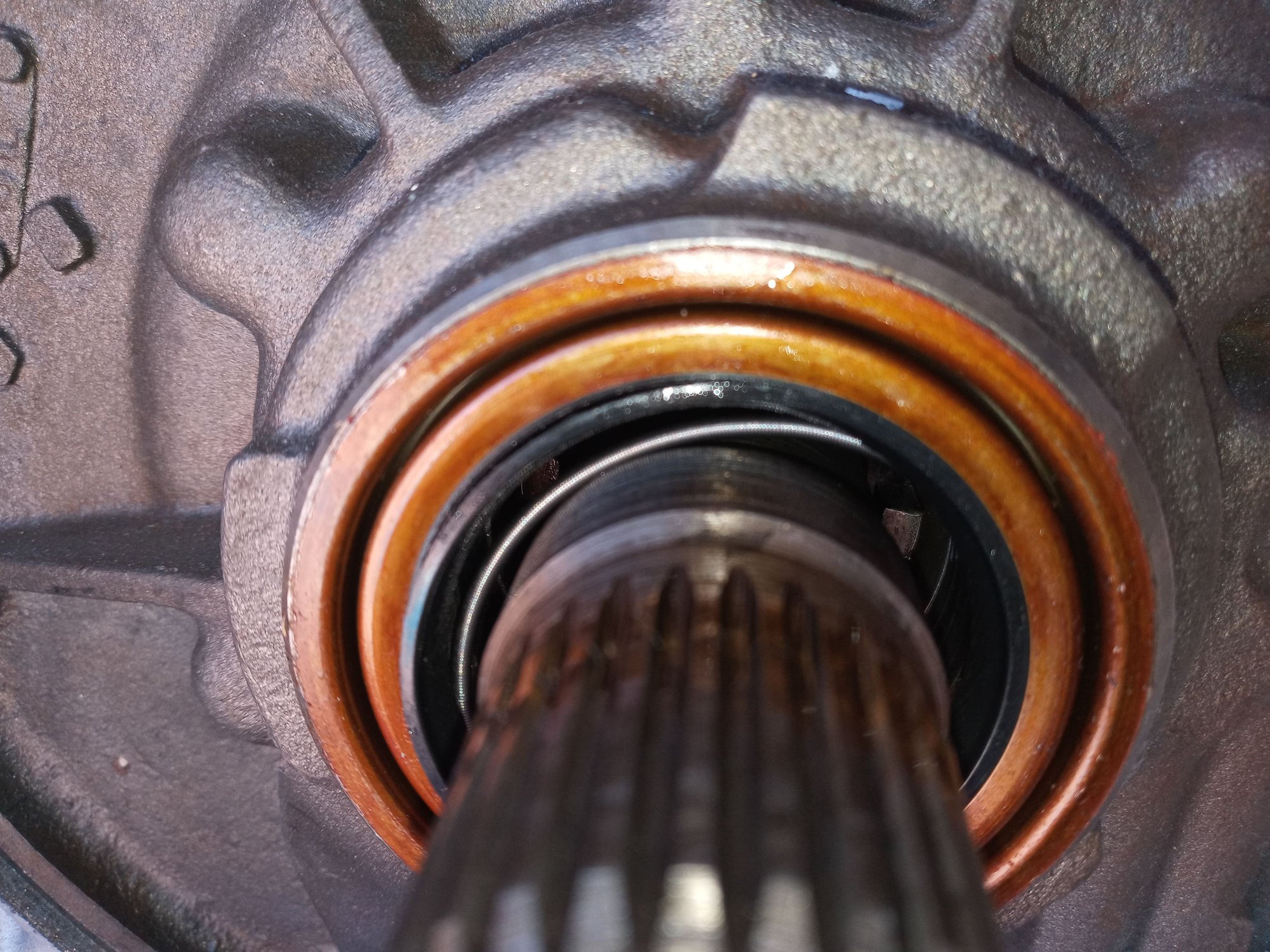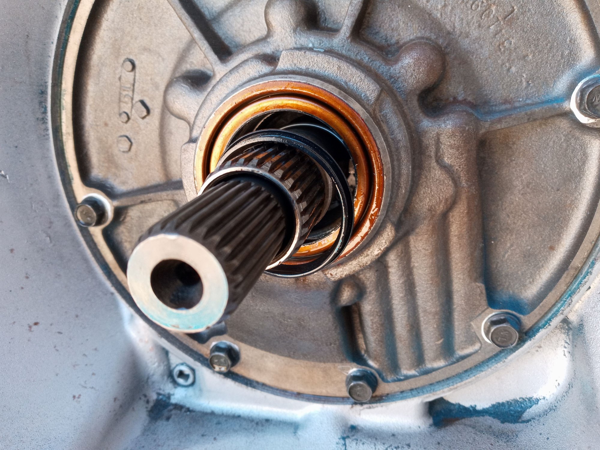 I see a damaged race seized onto the converter shaft and the seal is completely broken and detached.