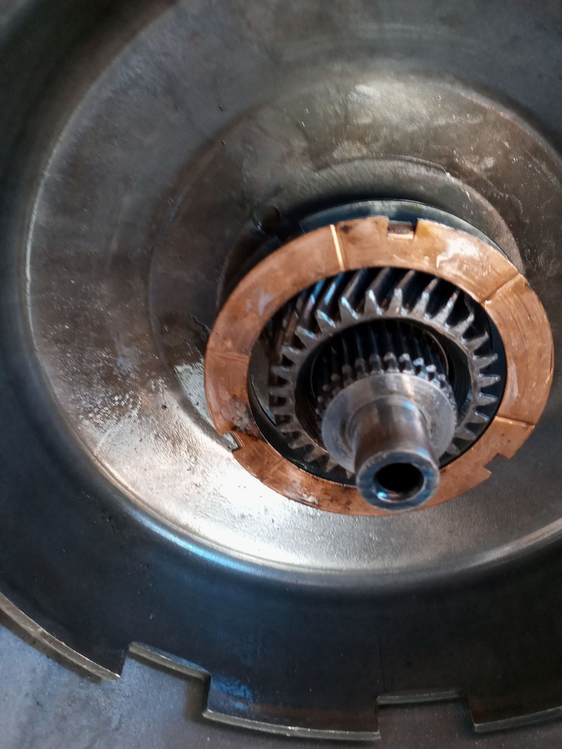 Take a look at the pics, I'll comment under each one... Take a look at the diagram because behind the 'front annulus gear assembly' goes ONE 'thrust washer'! This is where the ONE 'thrust washer' in the diagram is suppose to go... See the holes where the tabs on the washers go into??? This is how it was assembled by the shop I paid to rebuild it twice!!! What?! There's even a stain from where it use to sit! This is what threw everything off balance! This is what its' suppose to look like according to common sense and the Technical Guides diagram... Wow just wow... This is part of the damage cause by the gap created by the two washers incorrectly installed behind the 'front annulus gear assembly'. Ill' probably have to replace this... Right?? I'll provably have to replace the converter also? It's a cheap one but if it works it works... I can heat or cut the bushing off... What about the oil pump body/housing?? Too damaged?? Probably a bad idea to reuse it...