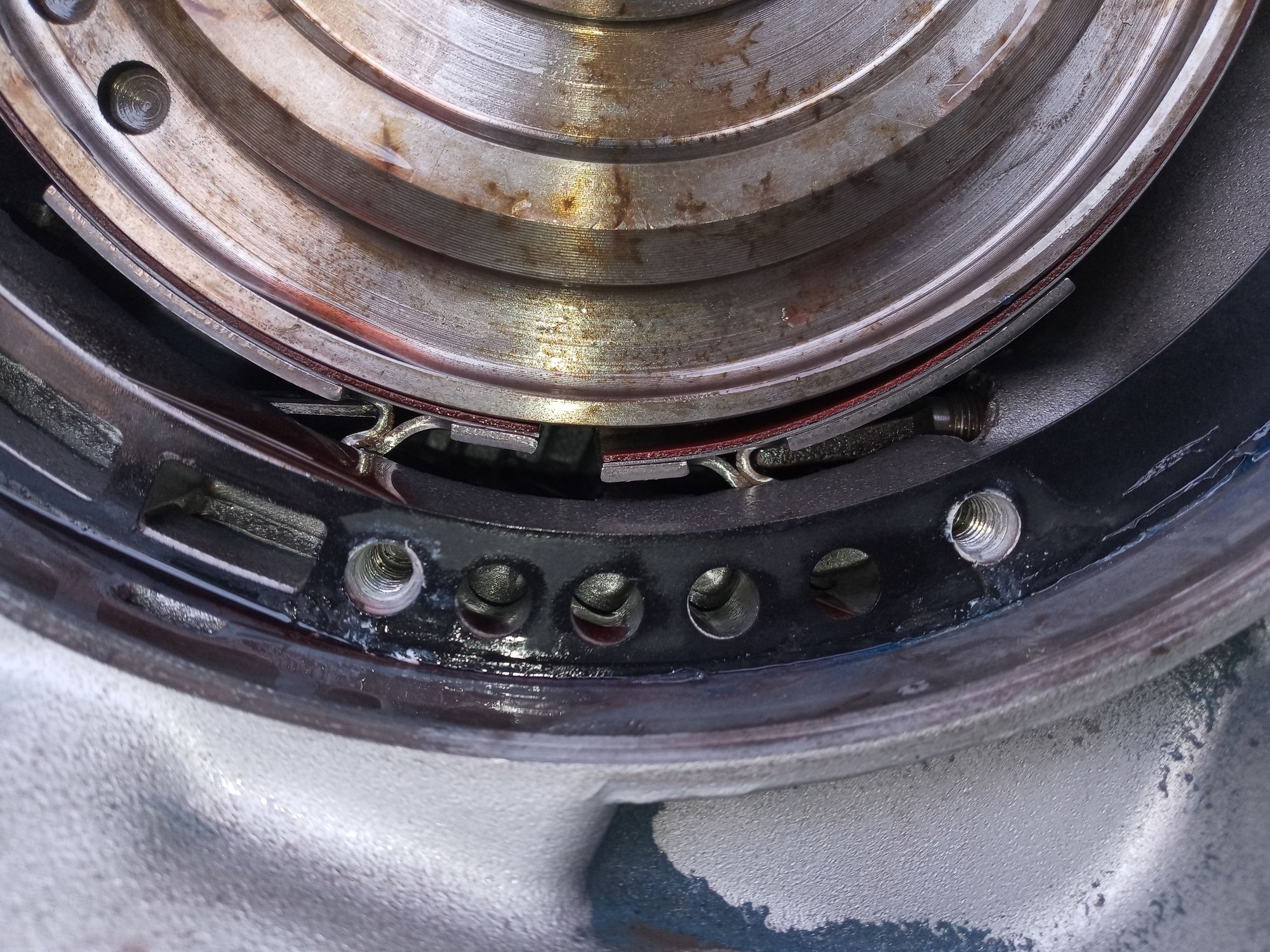 Here's what I've found so far... Is the band suppose to have that much of a gap?? Looks ground into by the ring on the tc shaft... The ring that's seized on the converter shaft ground into the pump orifice... This would explain the fine metallic sludge but not the bits and pieces of metal... Looks like a little contact wear... Is this normal?