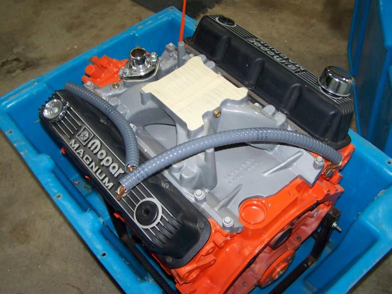The car came with a Mopar Performance crate engine. It is the cast iron head version 390HP. My pic will not down load so I will take another and post later. I will be asking lots of questions from the guys on this forum. I found a guy that bought a 70 cuda with a built 318 and he plans to pull the 318 and put a 500+c.i. in its place. I am working a deal to get the accessory bracketry, alt., power steering pump, ac, and radiator. He plans to make the cuda a "hot rod" no power steering or ac.