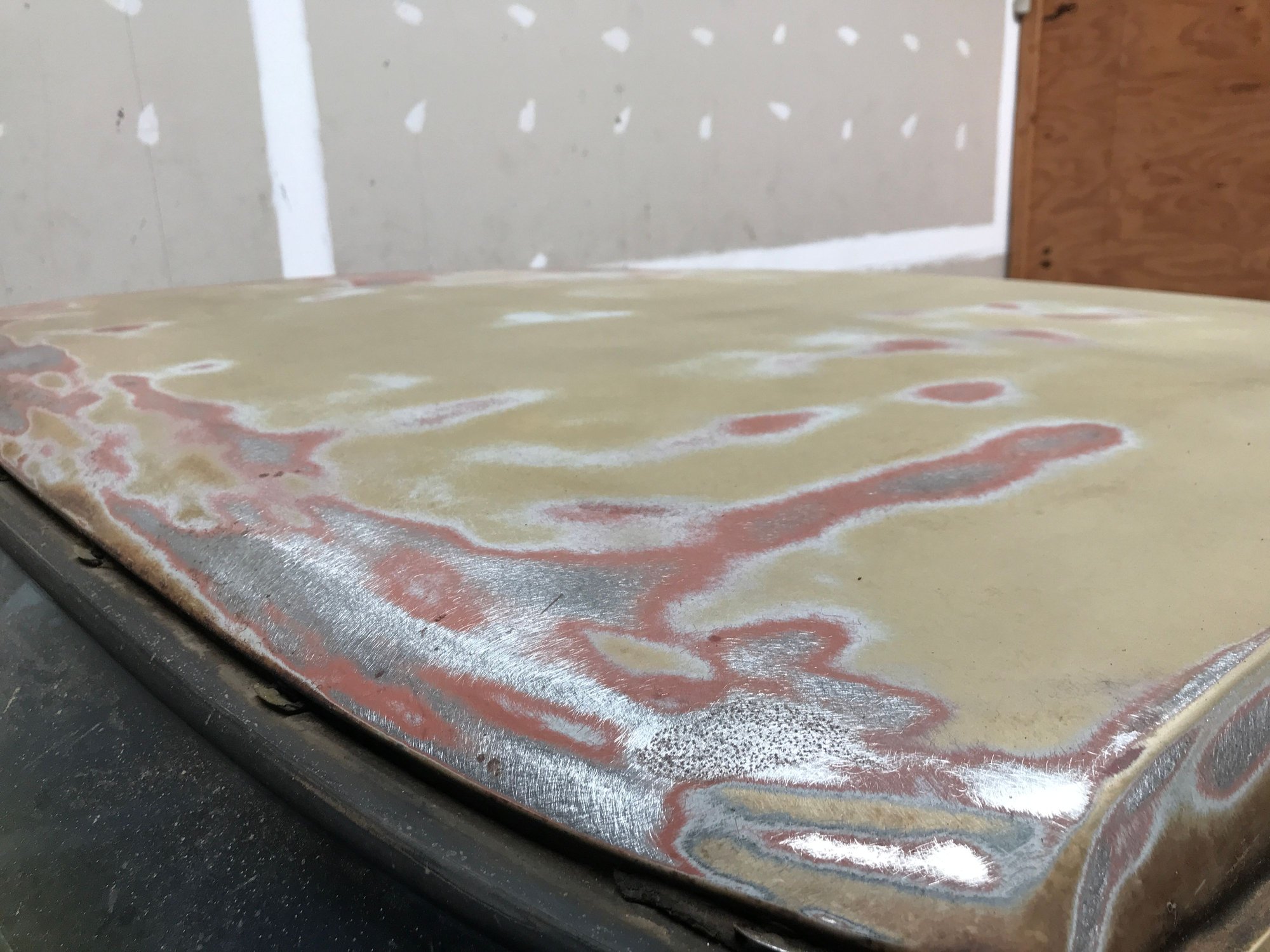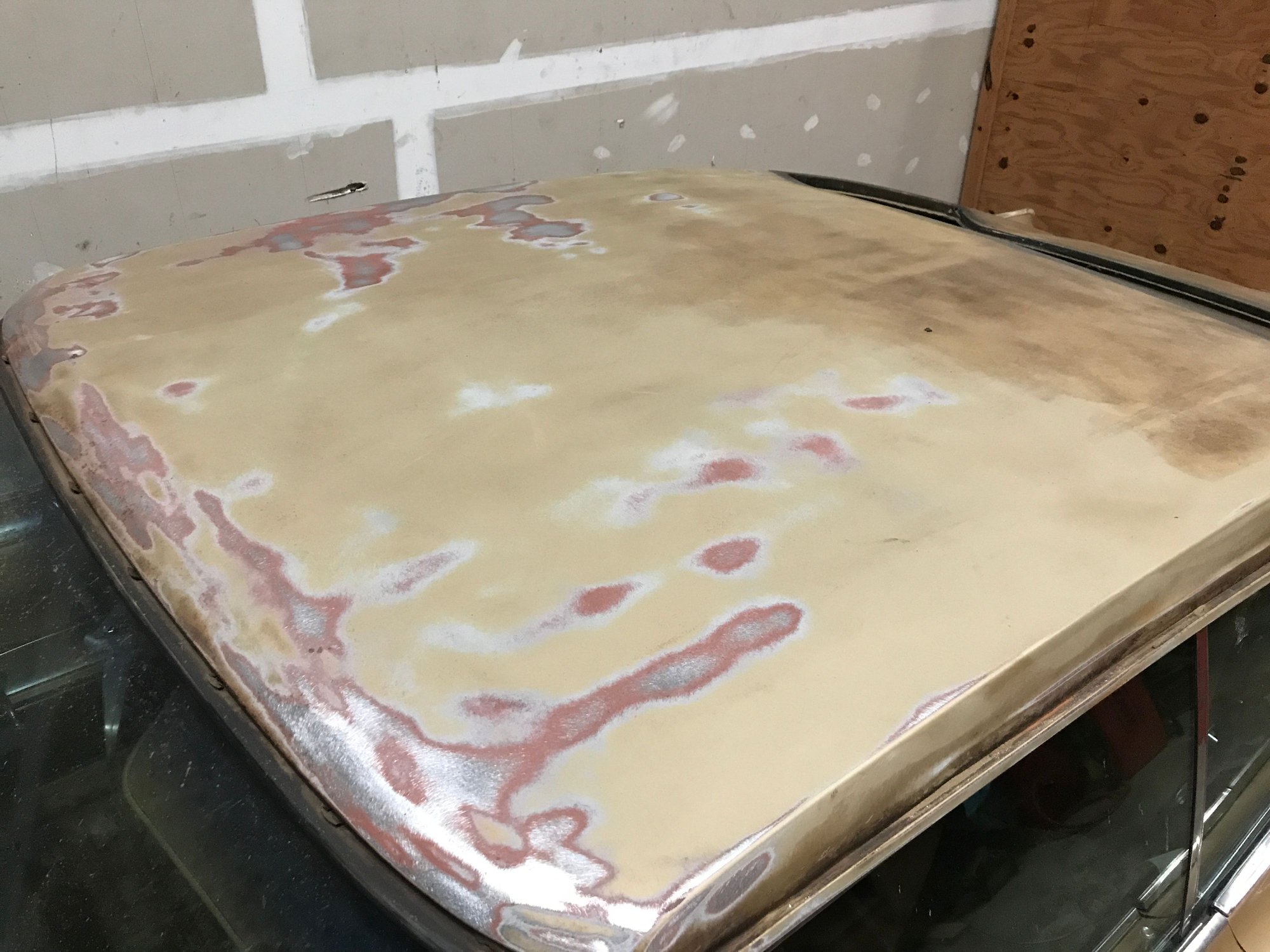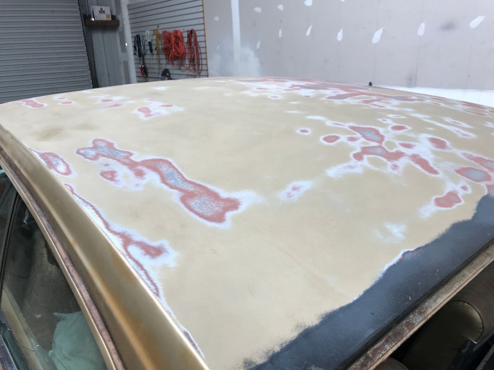 Good morning Bob, Thought I'd post a few photos of the progress I have made with my DA sander on the roof. Removed all of the surface rust and old adhesive from the vinyl roof. Check it out