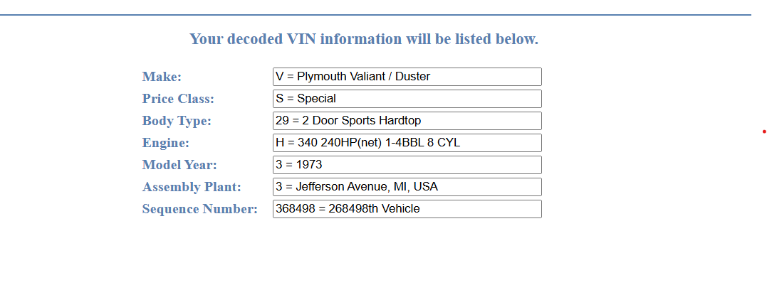 Hello All, I am new to this forum. I had a 1973 Plymoth Duster - 340 given to me when I was 18 by my Dad. The car has been sitting for 20+ years and now that I am older I have decided to begin the process of getting it running again. This will be a learning experience for me as I have never done this before. I was wondering I anyone had any suggestion How I should begin. I have A Title to the car, but it is still in the sellers name [It has been signed by the seller]. Should my first task be to get the title situated? I decoded the VIN for the car: