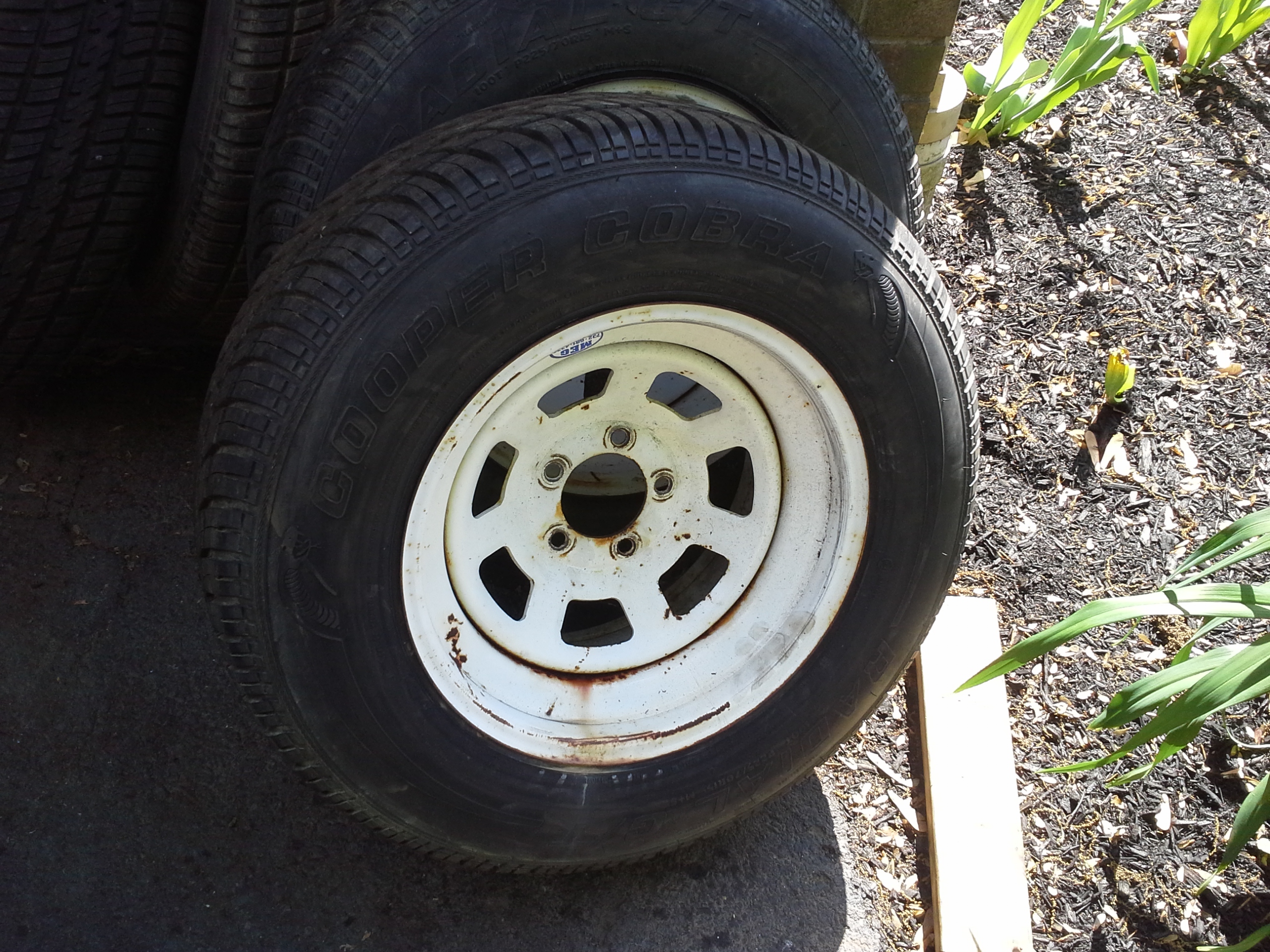 I have a set of (4) 15x8 white steel wheels that came off of a 73 Plymouth Duster . The wheels are made by Meg wheels in Belmar,NJ. (2) wheels are 3.5"backspacing the other (2) are 4.5" backspacing. Bolt pattern is 4.5"(fits Ford and Mopar) Wheels are in excellent shape except for some minor surface rust. Tires are Cooper Cobra Radials. They have 75-80% tread left. One tire has some rub marks from where the tire rubbed the fender. Tire size is (2) 225/70/15 and (2) 215/70/15. Asking $225 B/O or will separate tires from rims $125 for the tires $125 for the rims