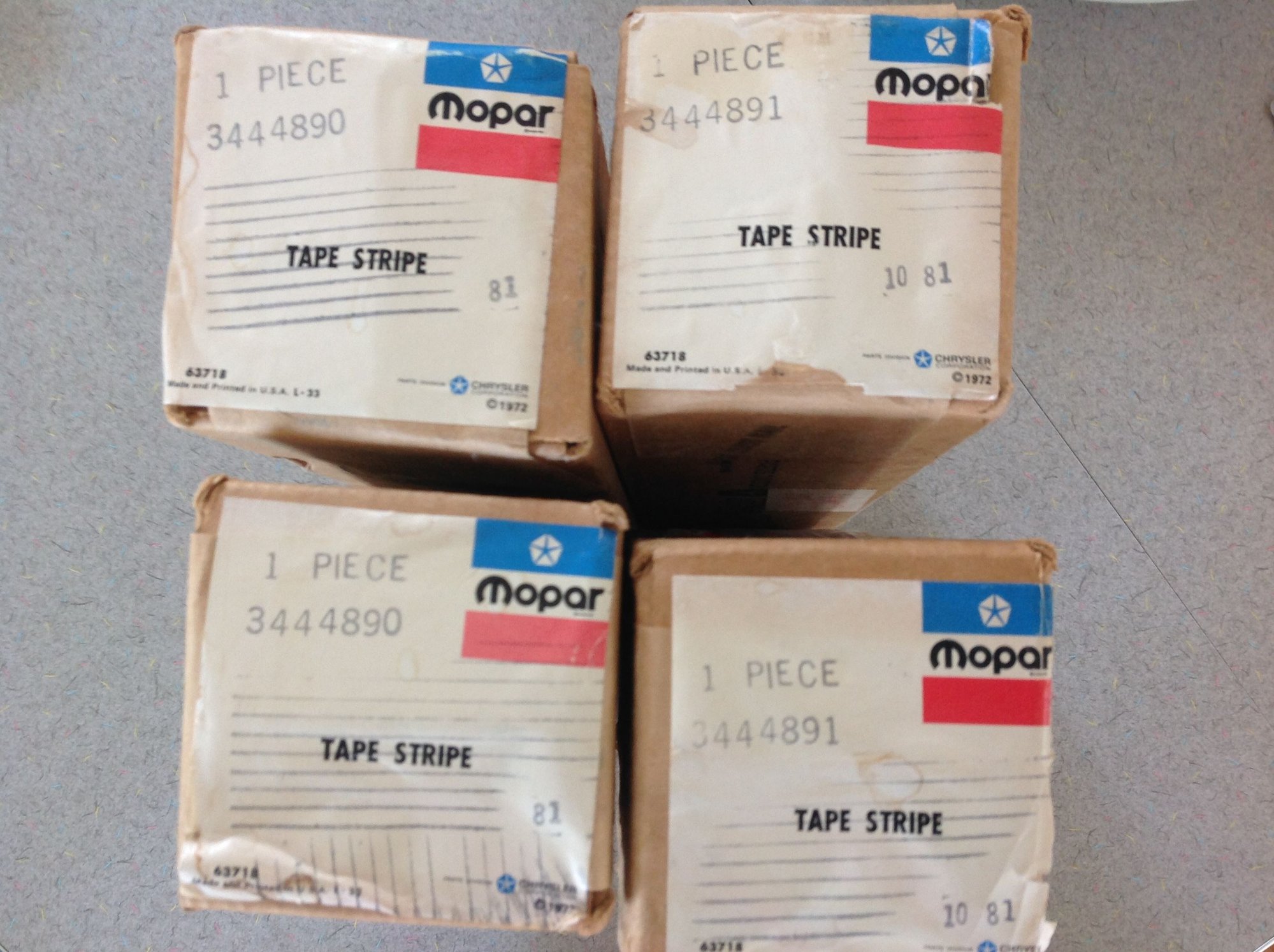 I have 2 sets (2left and 2 right) Hockey Stick Stripe kits. These are original OEM MOPAR stripe kits...In the MOPAR boxes and envelopes. One set was open to look at and take pictures. These include the small portion of the stripe that goes on the door. Great to display if you have a Cuda show car or add to any Cuda.