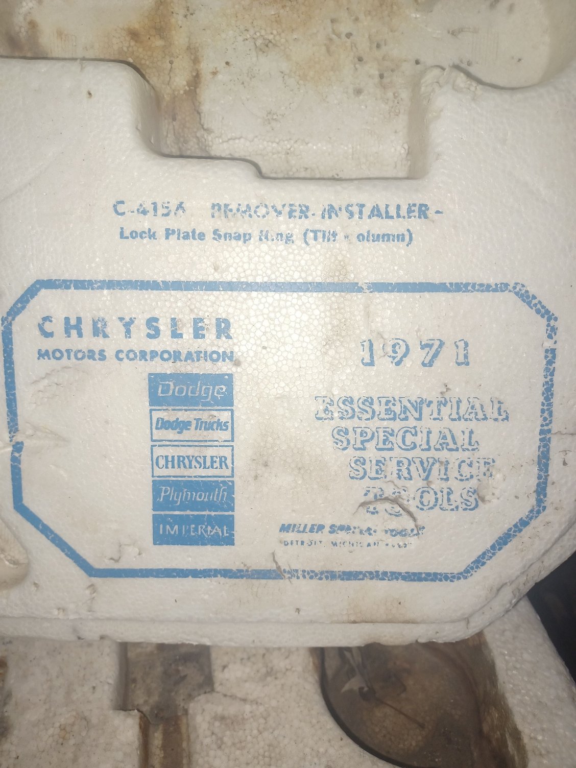 I have some Chrysler Essential Special Service Tool Sets in original Styrofoam casing.They Range from 1968-1971 I have all the tools however they got knocked over and due to some of the lettering being faded I can't tell what goes where. I know these are pretty rare and would like to know more about them maybe an old picture or pdf of them so I could put them back in order..would consider selling them . If anyone has any info please share I will be posting more photos of all tools as well as i go through them ..thank you so much