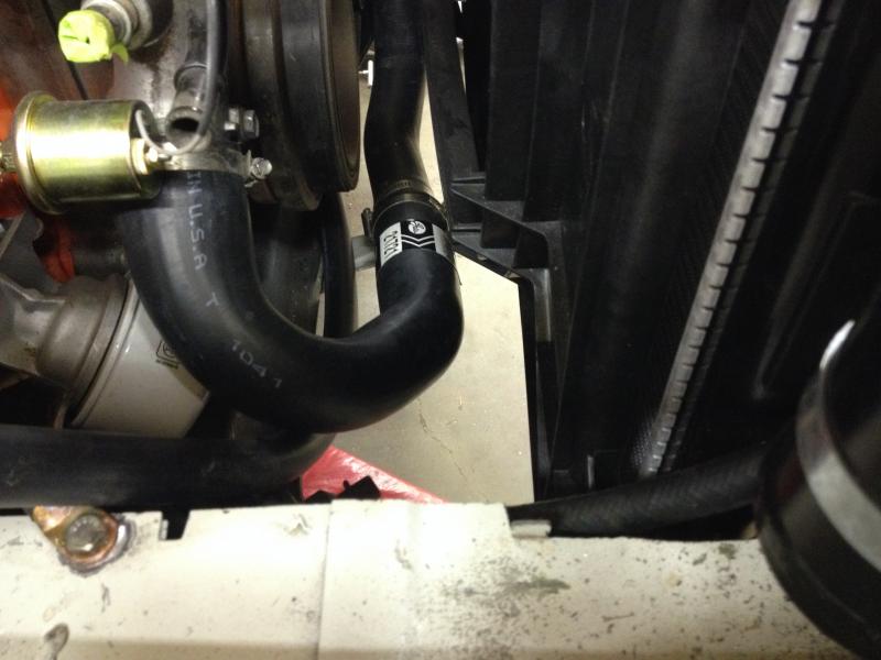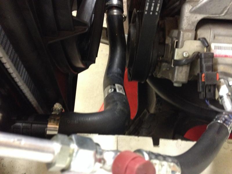 Here I'll show how we ran the radiator hoses top and bottom using parts from O'Reilly's auto parts. Just a note about O'Reilly's we have a great bunch of guys who like to help anyone with old or new hot rods. They came out to our shop and measured for the hoses and went back to the store and looked at hoses they had in stock to see if anything would fit. We used a top hose off of a 2011 Dodge truck, (Gates Belts) cut it in half (will have to trim some out of the middle for better fit)and inserted the filler neck from summit racing, part #SME-2201. On the bottom hose we used a bottom hose from a 2011 Dodge truck (Gates 21271) from the water pump and a bottom hose from a 2012 Dodge Charger (Gates 22941) from the radiator routed under the crank pulley. Cut both the ends off both hoses and add a copper plumbing reducer 1-7/8 to 1-3/4 this will connect both hoses together.