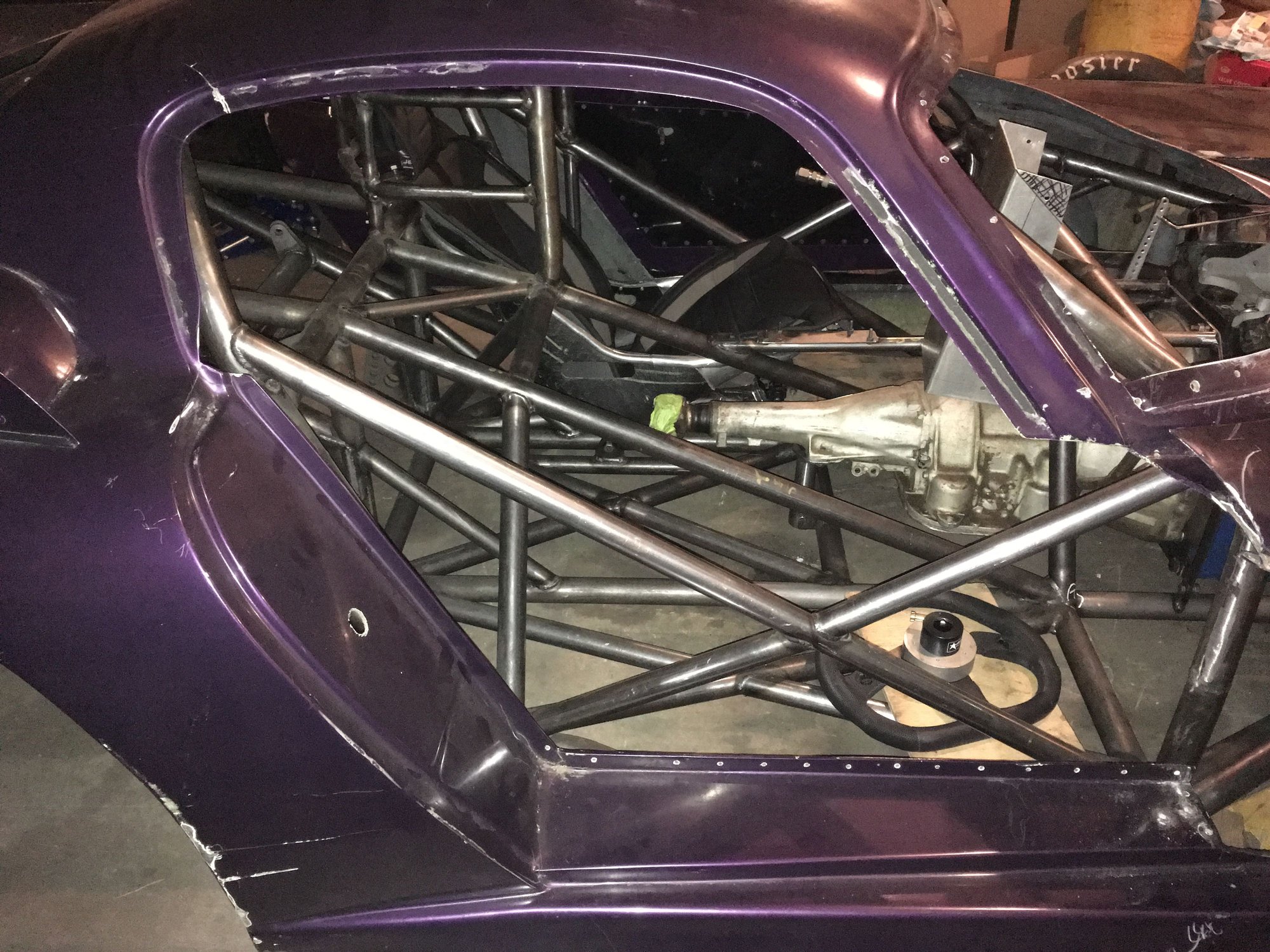 It’s nice the way tube placement fits the door without having the car when building it. We talked about it and to start the rear wing will come off and the 14” extended front end will be cut down to stock length to have stock wheelbase. I need to make an expected alteration to the A pillar tube as it has a bend that matched the Corvette. I’ll need to redo the wishbone and anti-roll bar mounts which is not a big deal. Biggest thing is tipping the four link mounts forward to match the shorter four link bar mounting hole radius. So a little more fun for me. I sat in the car with the body on and it’s real cozy in there.