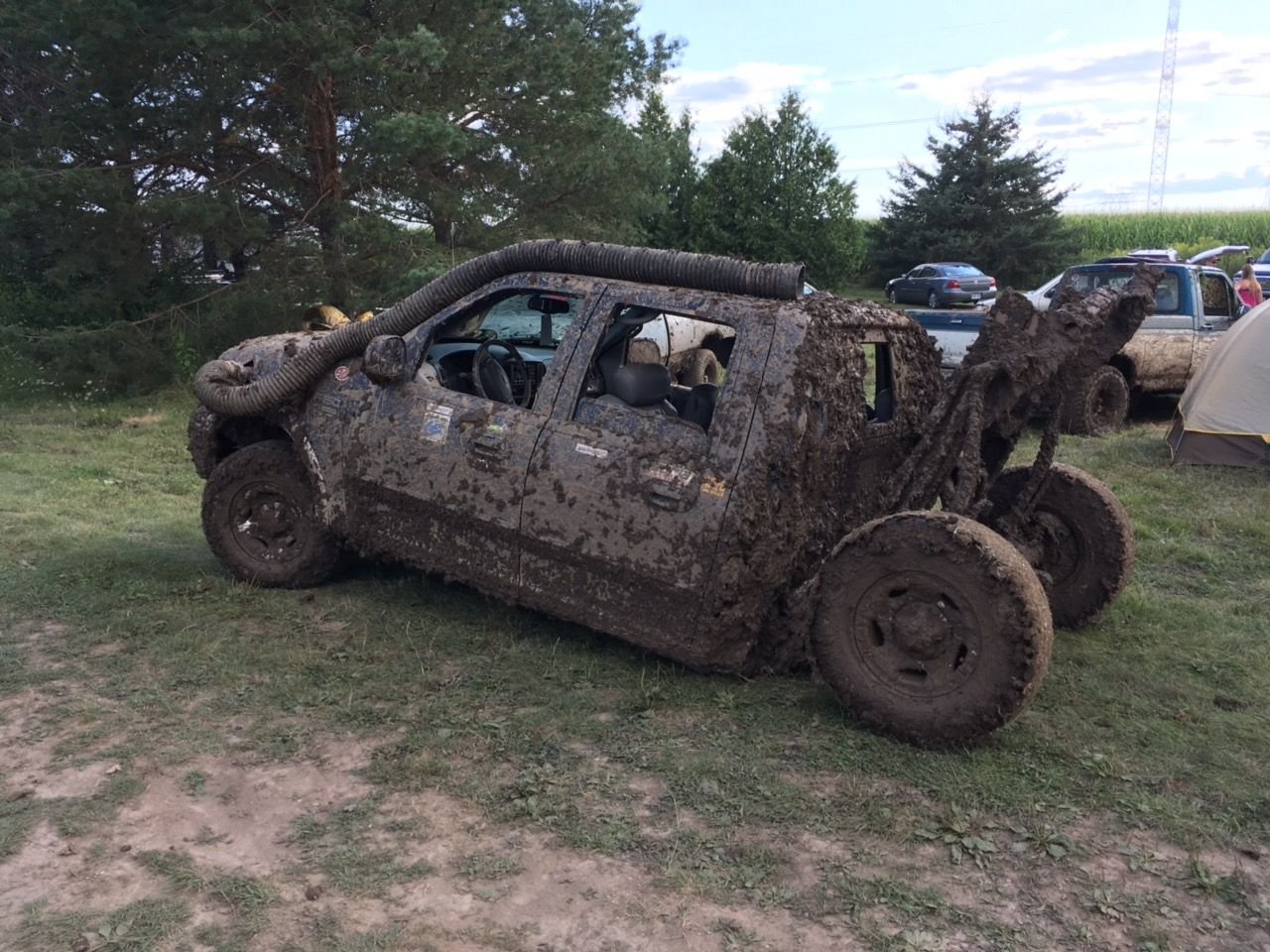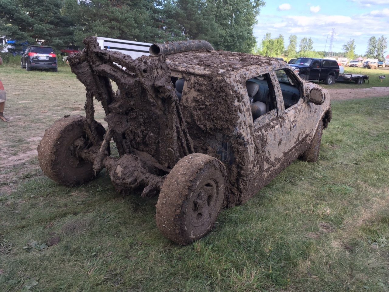 4 wheel drive Ford pick up without the box. Frame broke just behind cab, rear wheels were still turning until the driveshaft broke. Steve said it was still moving forward with the front wheels only until the driveshaft broke, beat up the gas tank, smashed the fuel pump which stopped the engine. Steve said he thinks if the engine didn't stop the front wheels might have pulled him out of the hole he was in with the momentum he had. It was a local mud run.