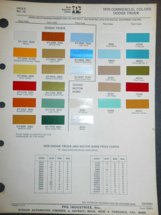 I have a 1975 Dodge D100 Long bed and I just bought it after it sat for 8 years. The paint looks to be in way too good of condition for it to be original, but considering the rest of the truck is in pretty good condition for its age, having 55,000 miles, and I see no signs that it was repainted, its possible it could be the original paint. Though when I look at a sheet online that shows the 1975 Dodge truck colors, the shade of blue that the truck is isn't on the sheet, so I'm unsure if it was even a possible paint option out of the factory. The sheet I was looking at is attached below, and also pictures of the truck. I'm pretty sure the blue is medium blue metallic. Also, the tarp is over the bed to keep pine needles from sitting in it. Its a very early 1975 truck and the actual year it was produced was 1974.
