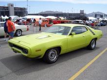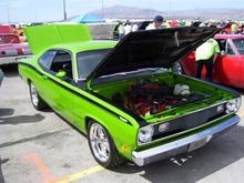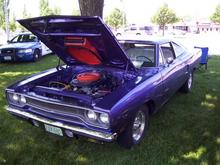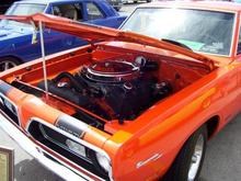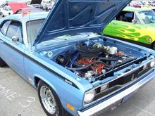 My Petty Blue '73 Cuda. '69 383, 30 over, 509 cam, 590 springs, Edlebrock 800cfm carb and Torker single plane intake, Hooker Comp headers, 4 speed, pistol grip shifter, 355 suregrip, manual steering, heater delete, 15x6 front, 15x10 rear, all welded stainless exhaust with Spintech mufflers, pin-on fiberglass 6 pak hood. Very loud. Fun to drive!