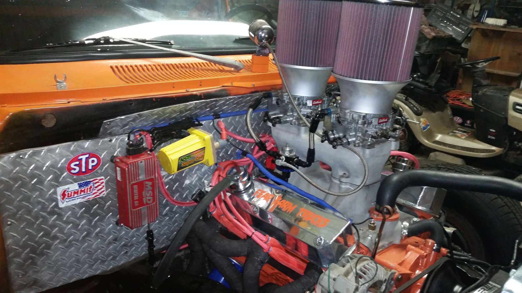 360, dual edelbrock 500 AVS, offenhauser intake, comp cams extreme energy camshaft, J heads with 2.02/1.60 valves, KB pistons, mopar windage tray, msd ignition