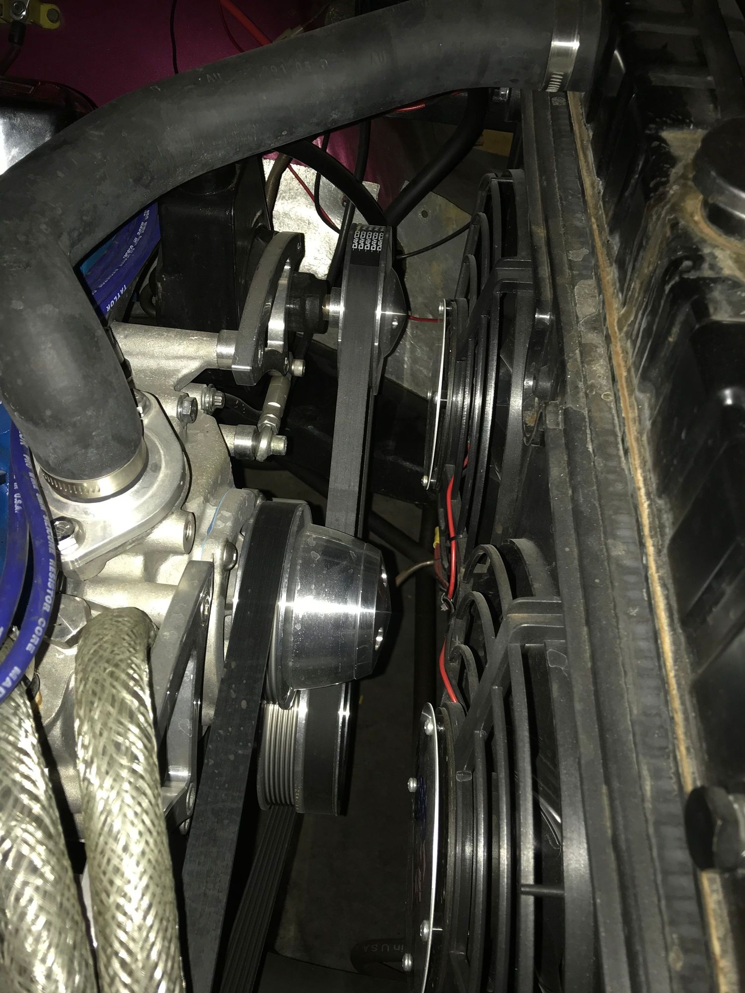 This pulley set up is the reason for the duel fans. The single was about 1/4 inch into the water pump pulley. With two they kind of straddle it.
