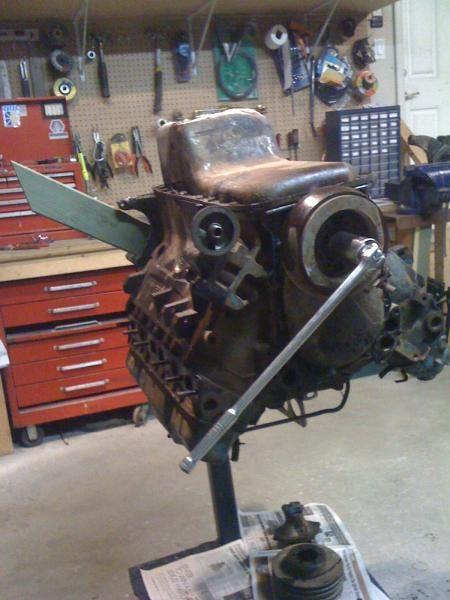 Even with the wood wedged between the flex plate and stand, still needed a snipe and a backup person on the engine stand handle